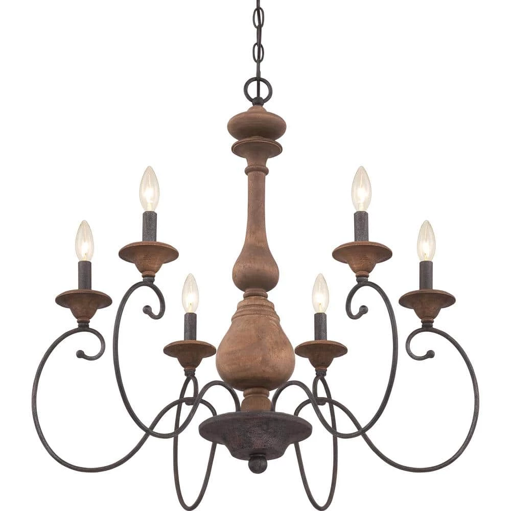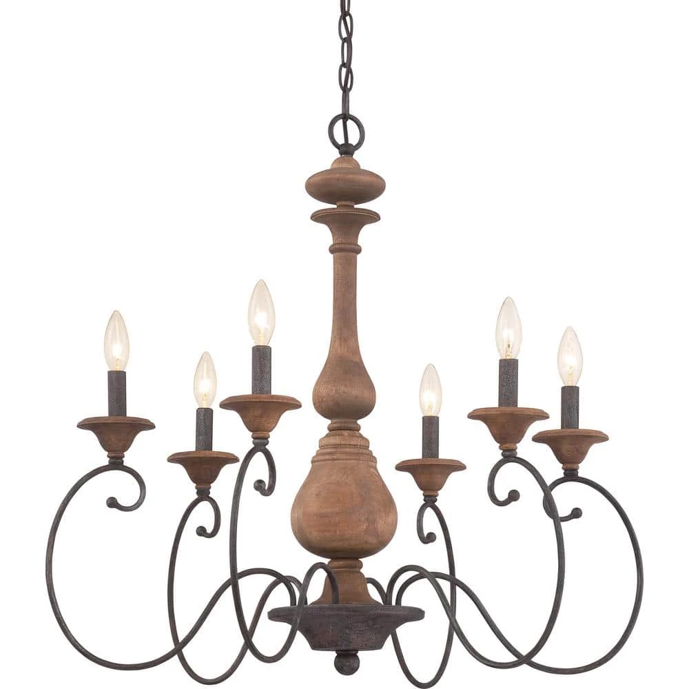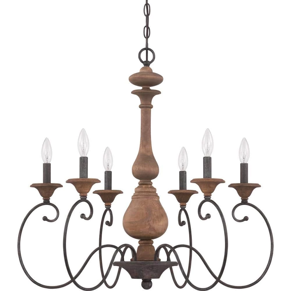 Natural aesthetics and a feminine style bring the European inspired design of the Auburn Collection to great heights. The finish is a textured and rich Rustic Black with an aged appeal that is featured on the scrolling arms and candle sleeves. The beautiful walnut stain highlights the unique wood patterns that make this chandelier everlasting.