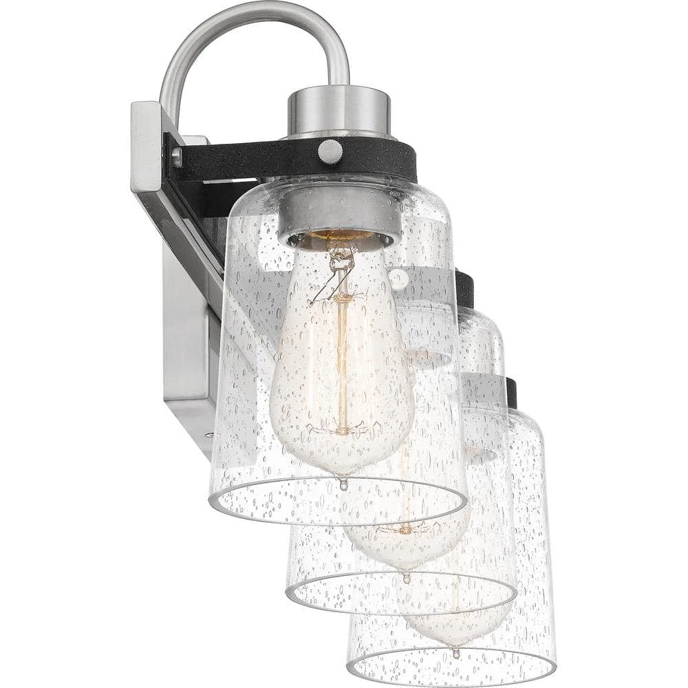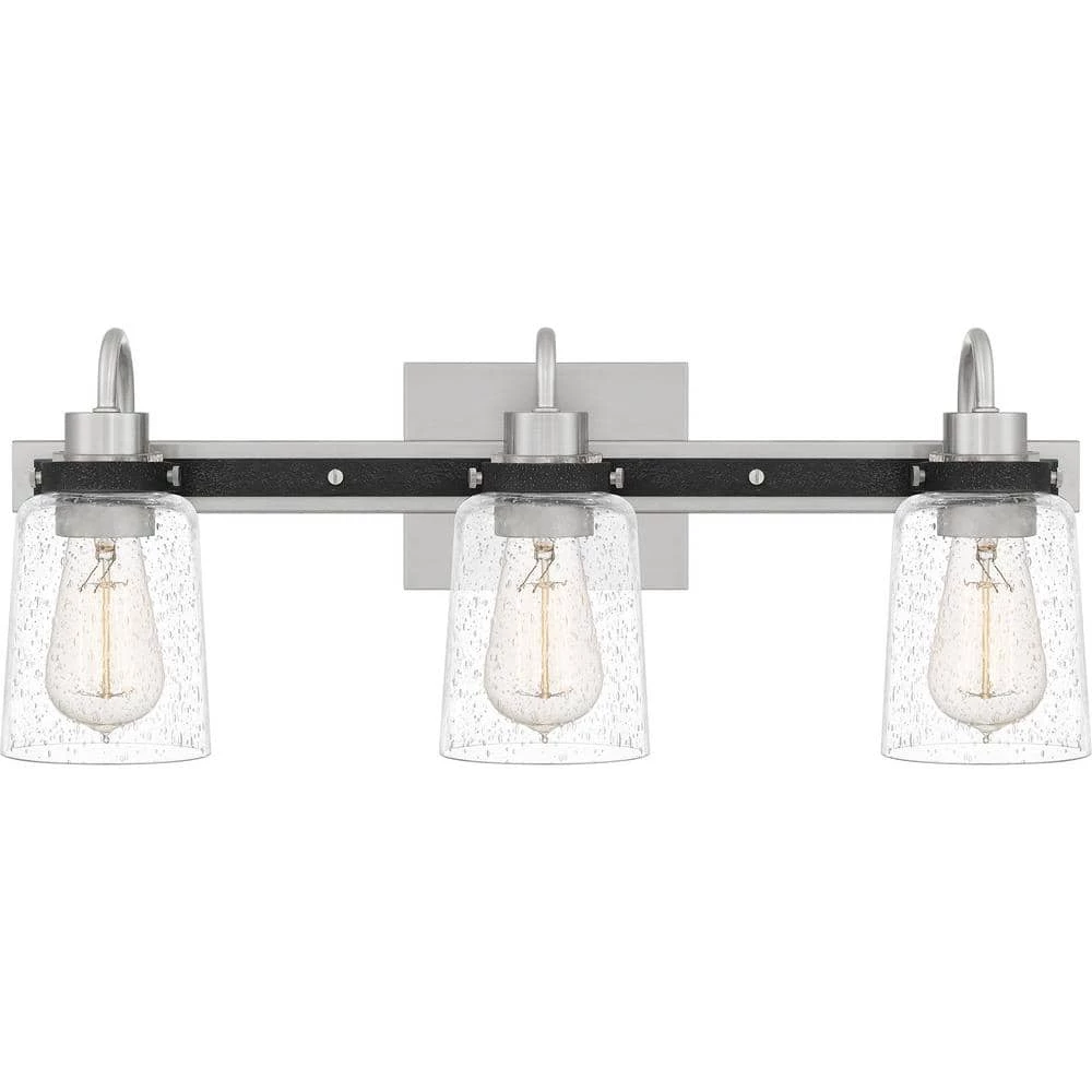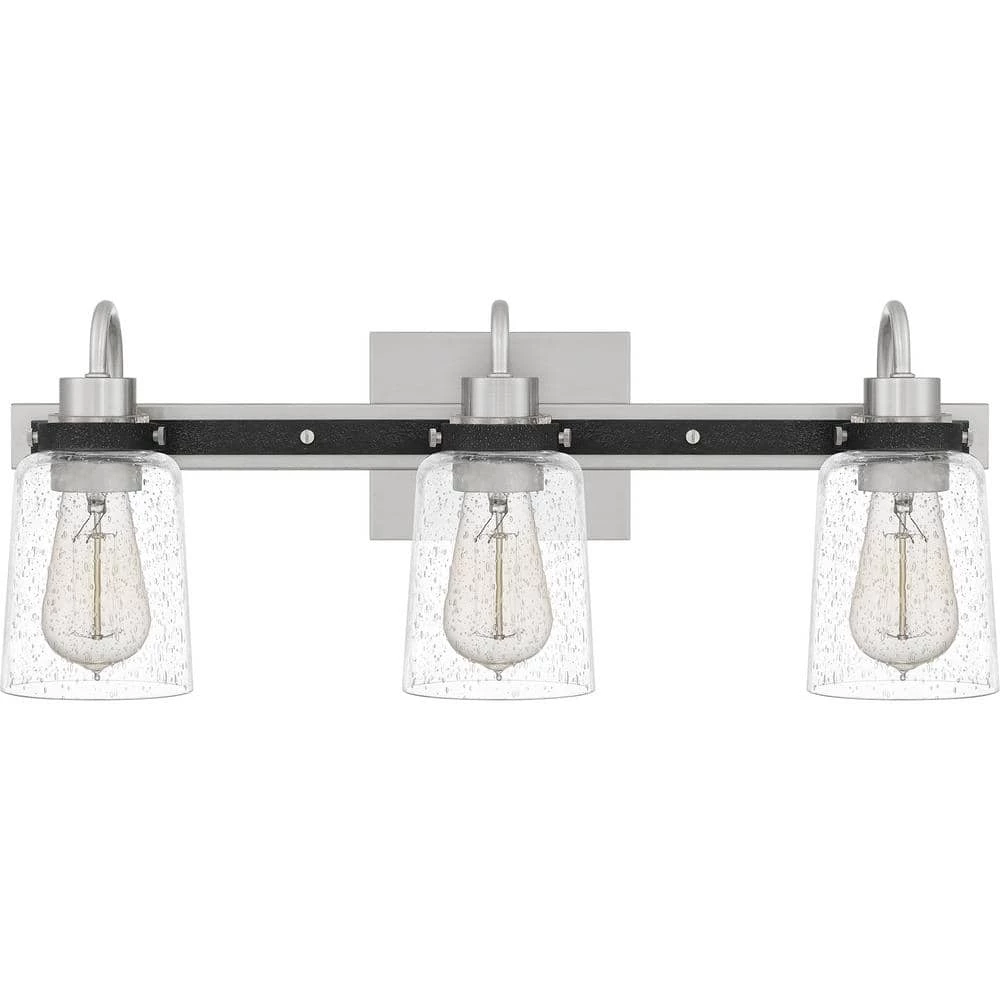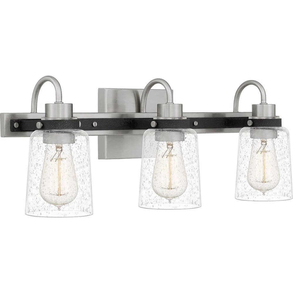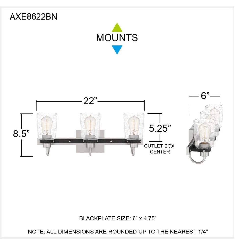 A timeless Brushed Nickel finish and clear seeded glass shades are the highlight of the Axel collection. Available in many different sizes, these versatile bath lights are sure to elevate your bathroom and give you a spa-like experience. A simple silhouette and black industrial style accents give these light fixtures a unique flair, making these great additions to any transitional or farmhouse inspired room.
