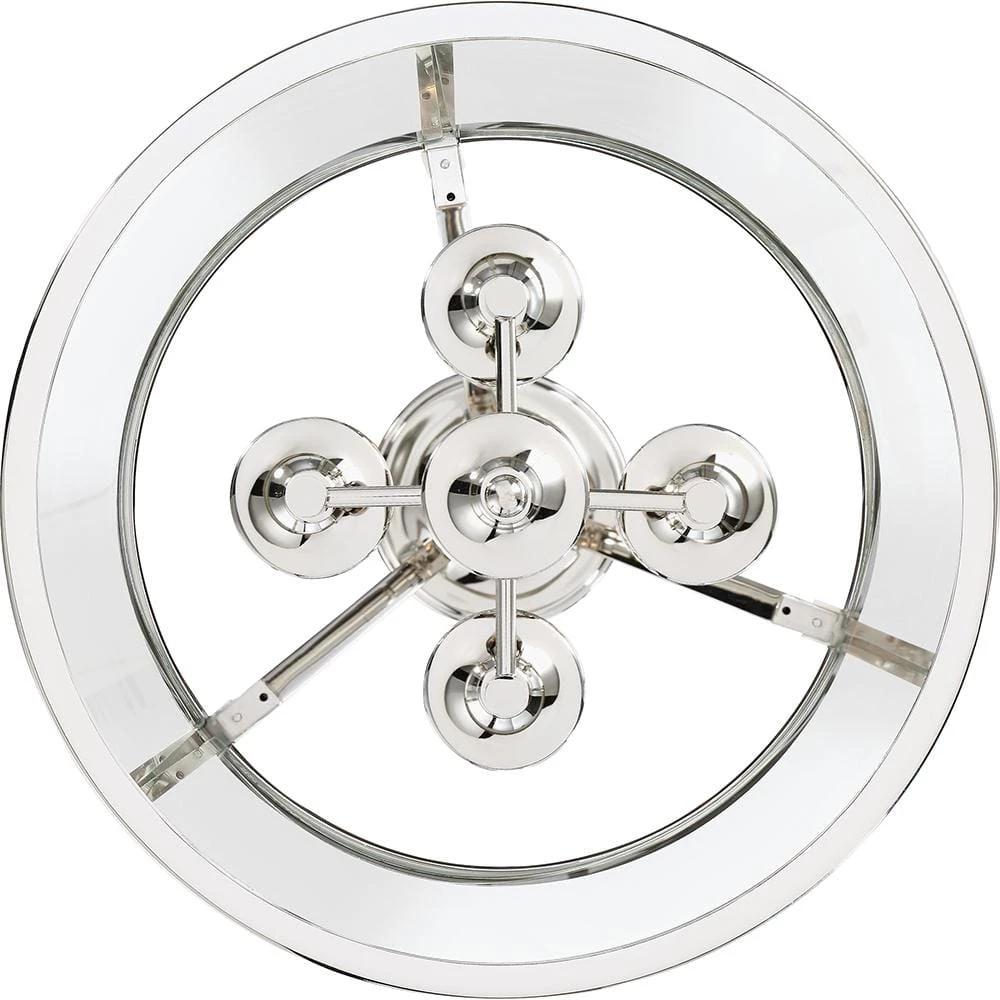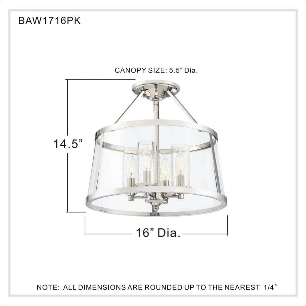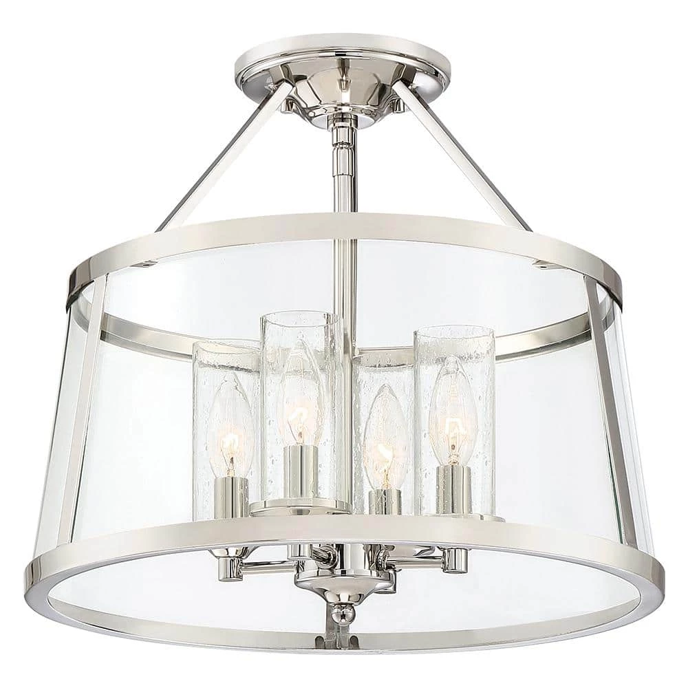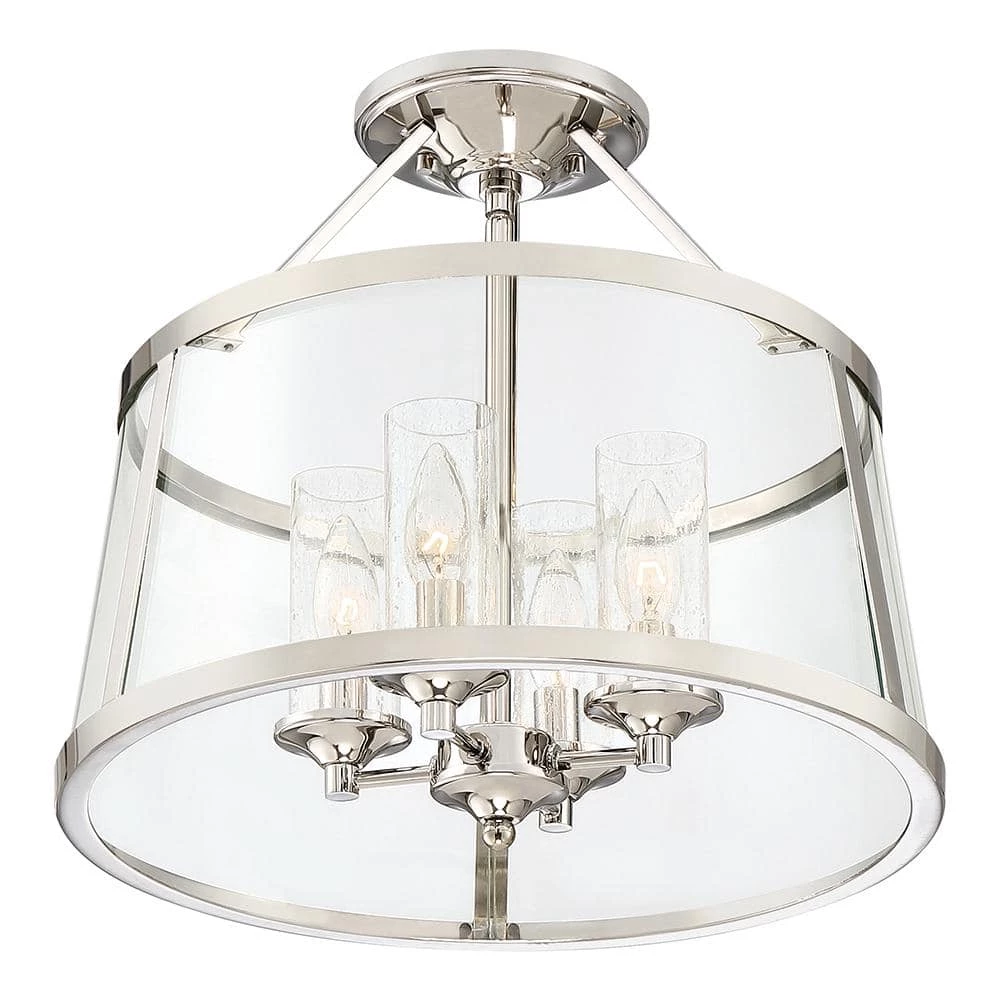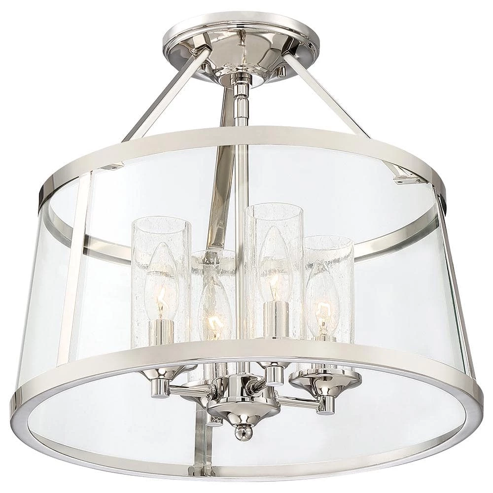 The Barlow’s transitional design adds simple sophistication to any space. The gleaming polished nickel frame highlights the beautiful drum silhouette of the outer shade, which features clear bent glass panels. Within the drum, seedy glass surrounds each individual candle, creating a layered look that’s sure to please.