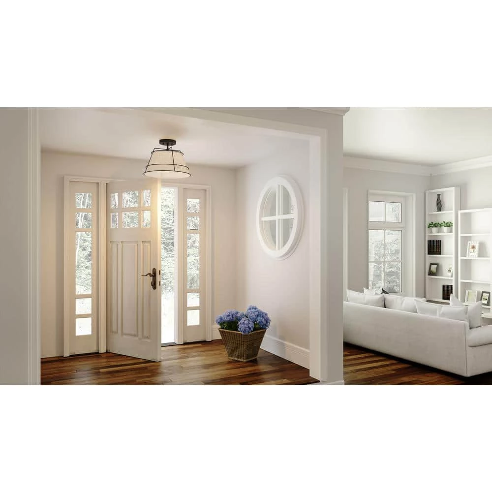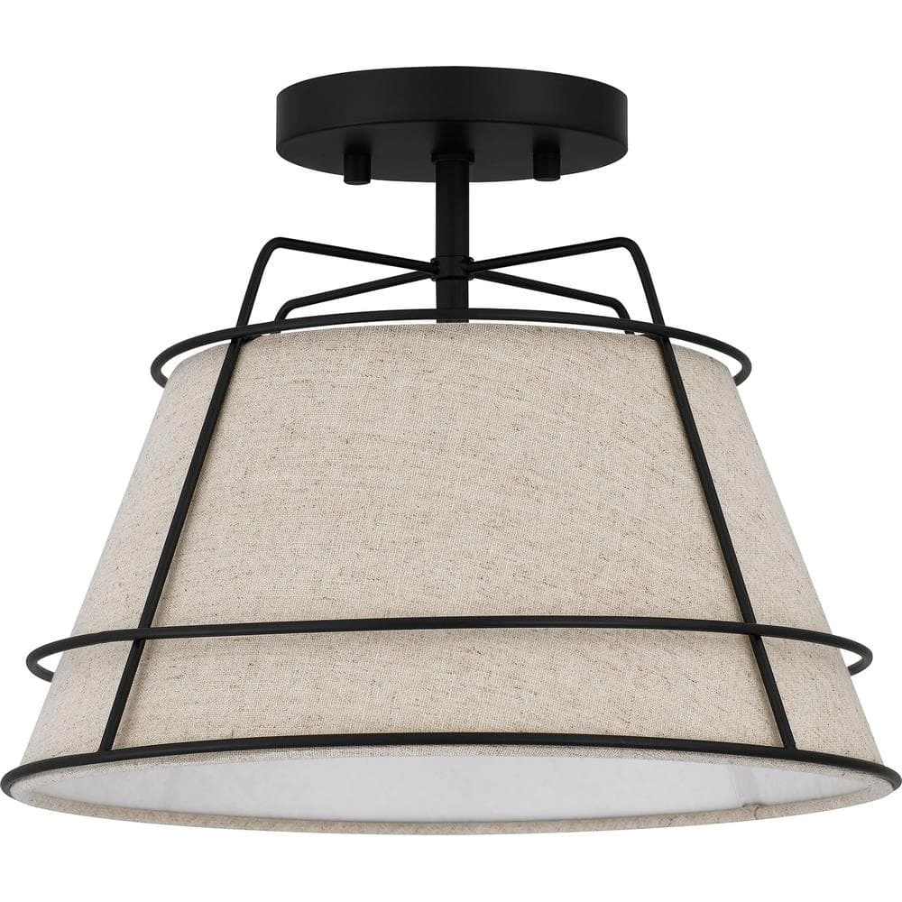 The Burbidge semi-flush mount light illuminates soft texture thanks to a white fabric shade. Sleek matte black lines envelop the shade, adding an element of industrial style. This design is ideal for contemporary and transitional spaces, infusing a subtle dash of warmth and whimsy.