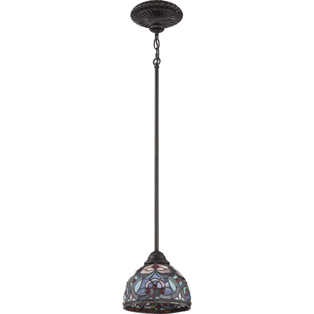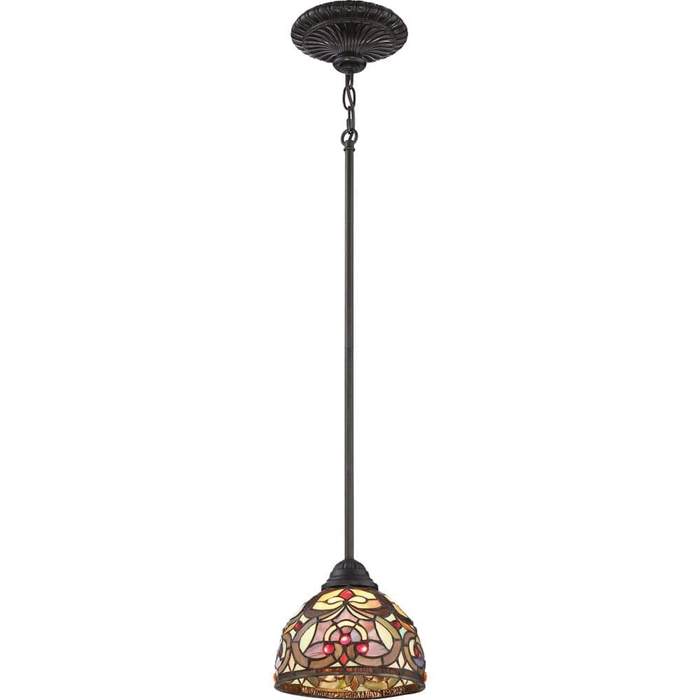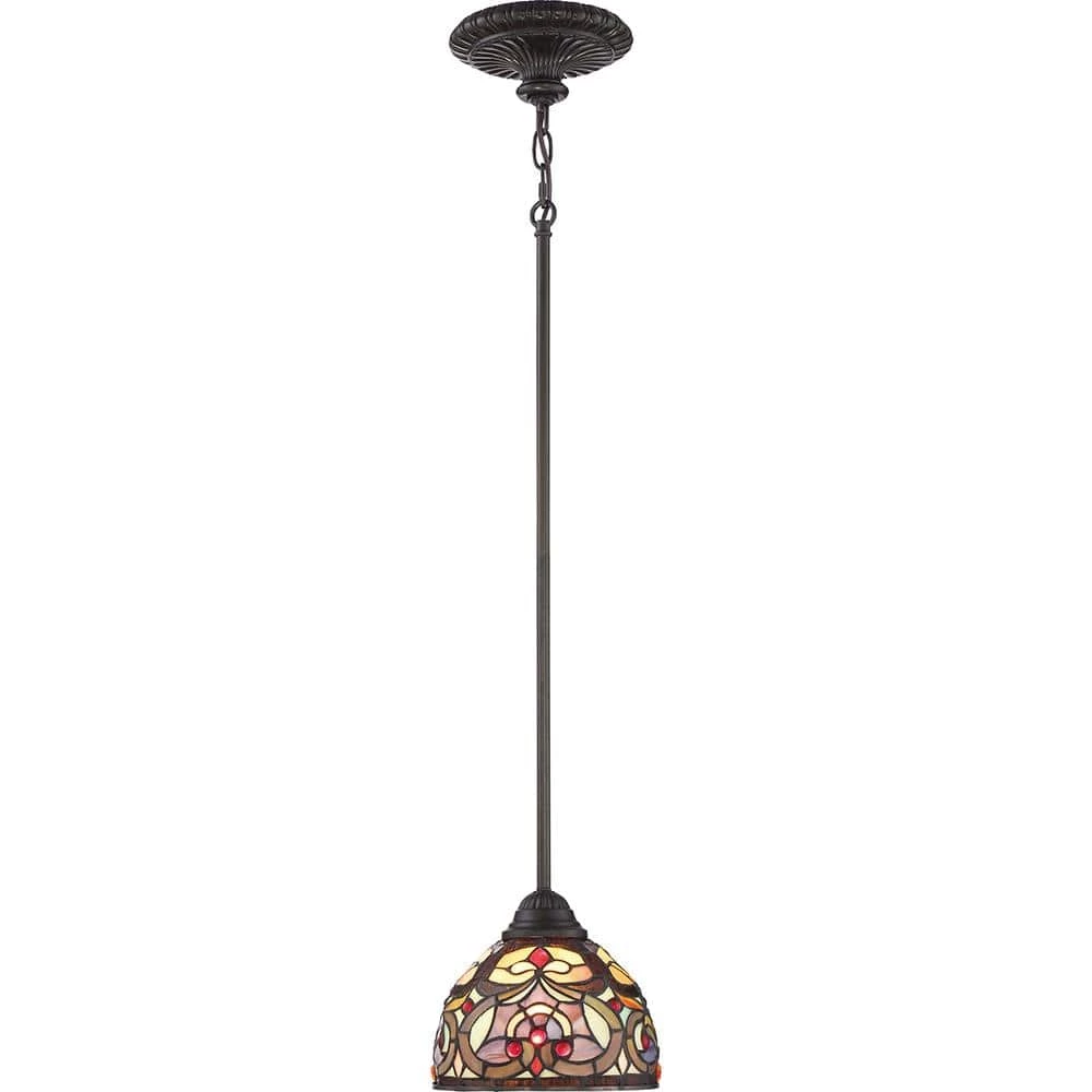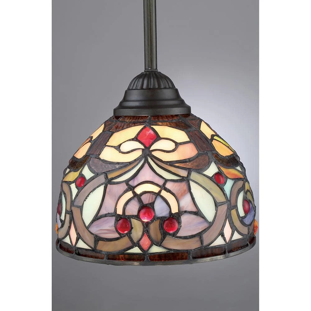 A staple of stained glass that will forever be in style, the Carroll Collection features an arrangement of art glass that evokes a heart pattern accented with jewels in red and amber. The Vintage Bronze finish completes the look. This fixture adjusts to accommodate various ceiling heights.