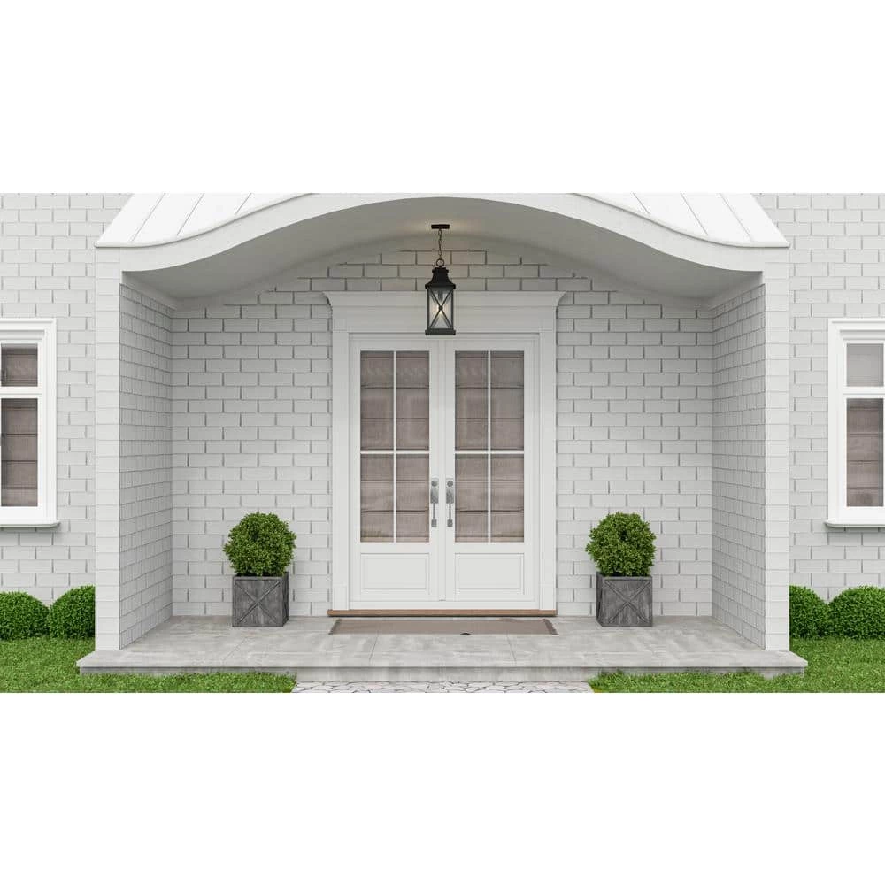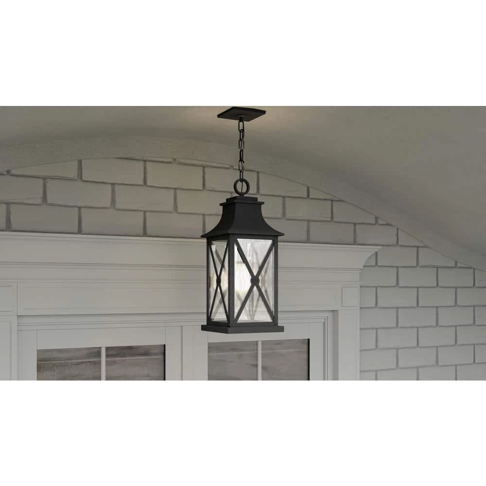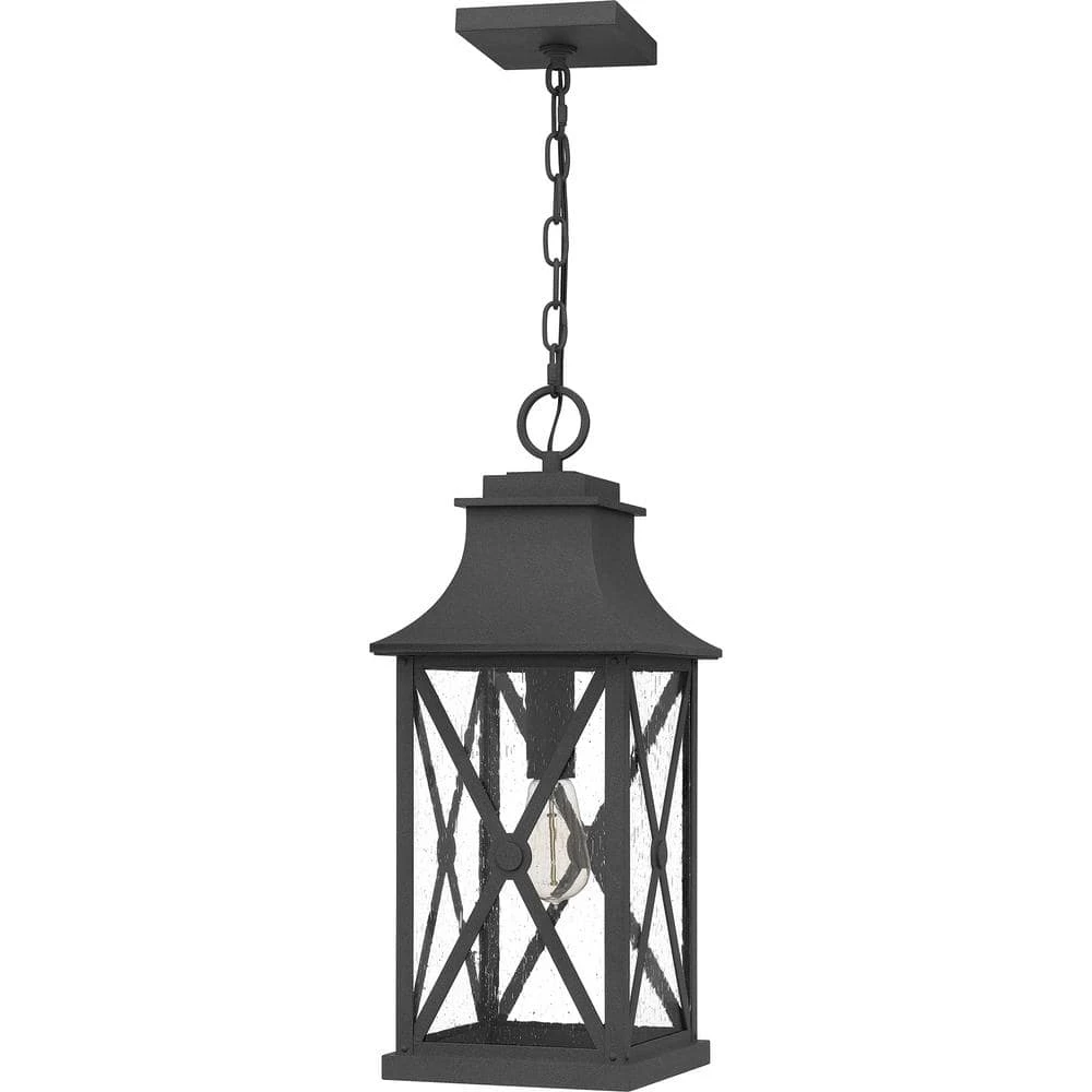 Add instant curb appeal to your home with the Ellerbee collection of outdoor lanterns. The rectangular frame and metal lattice work create a transitional feel that complements any modern farmhouse or coastal style home. Clear seeded glass panels are coupled with an enduring mottled black finish for an extra layer of charm. Ellerbee comes in many options including a hanging lantern, wall lanterns, and post lantern to round out your home’s exterior. As part of our Coastal Armour collection, this product is durable, marine grade, and comes with a 5-year limited warranty.