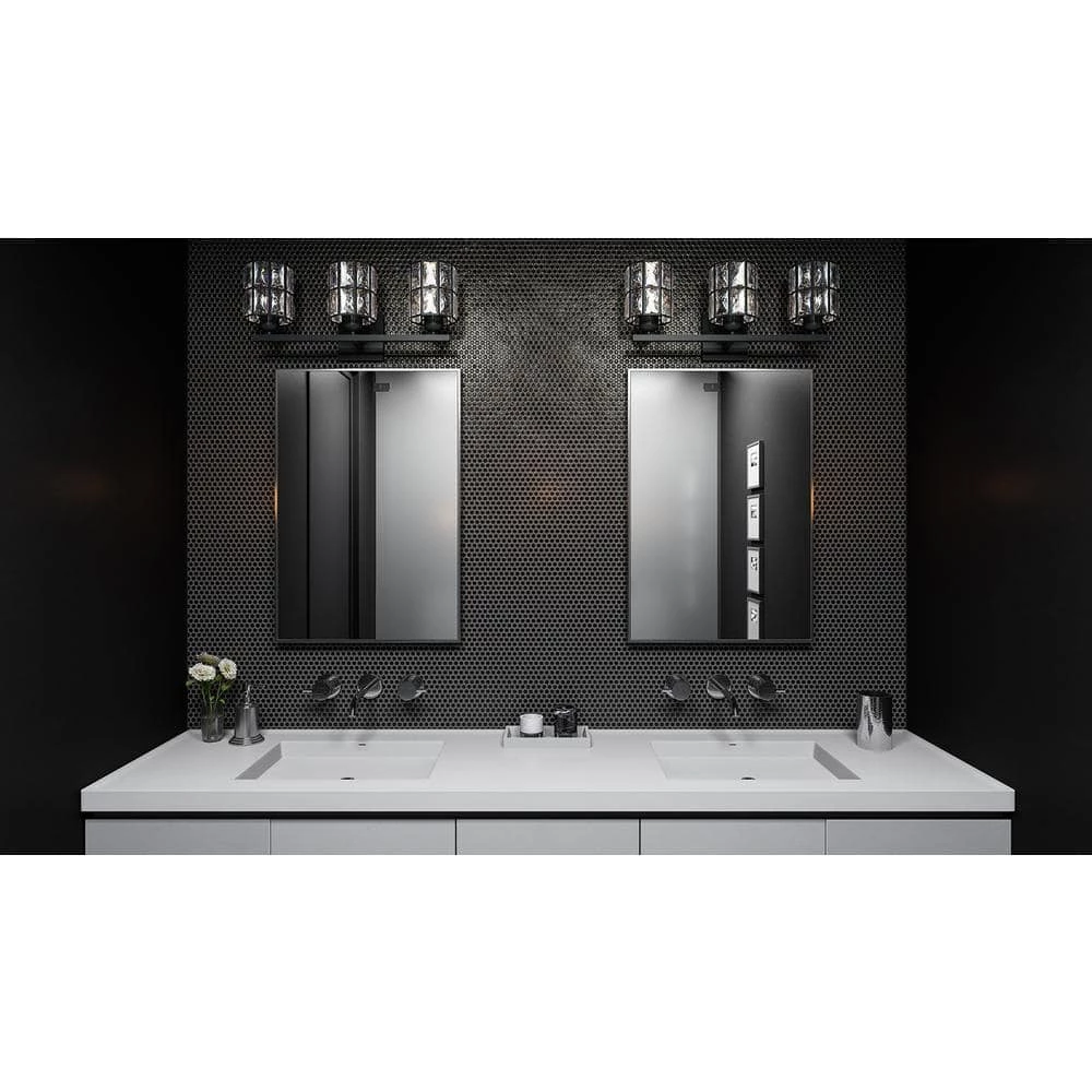 Add instant mystique above a bathroom vanity with the Gibson bath light. A clear beveled crystal shade creates a dazzling play of shadow and light, paired with a matte black or polished chrome finish. Configure this glamorous fixture up or down depending on your lighting needs.
