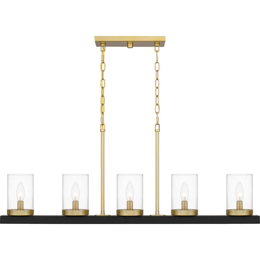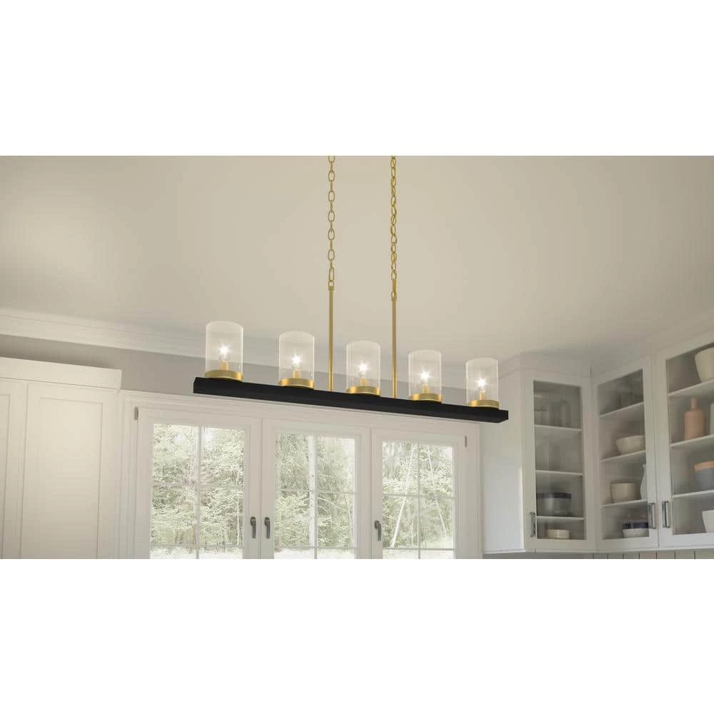 Modern glam from above. The Greeley chandelier features sculptural gold framework, clear glass candle cups and a bold, matte black ring base. This design is also available as an island light, illuminating high style in the kitchen.