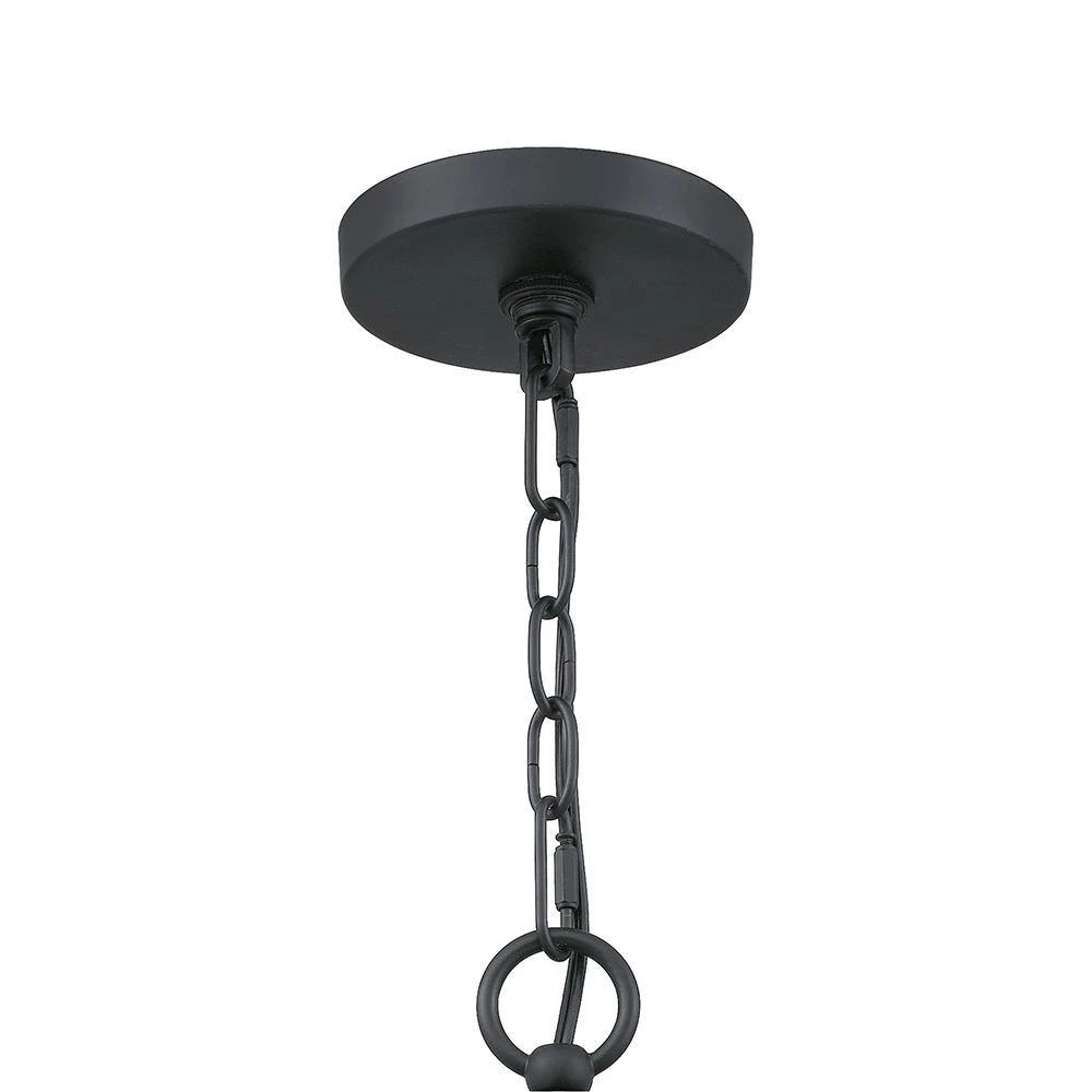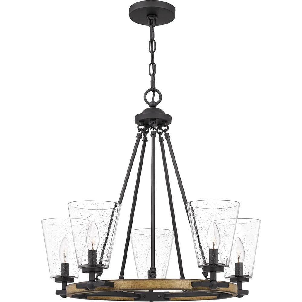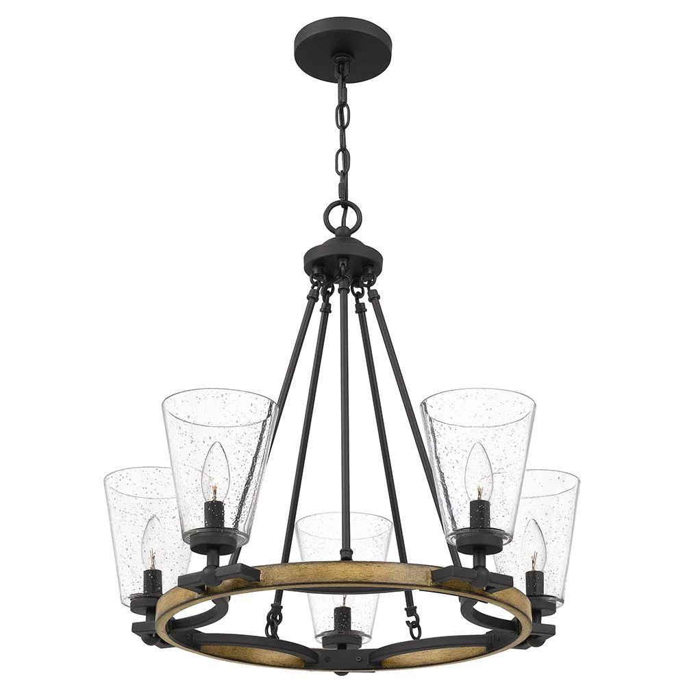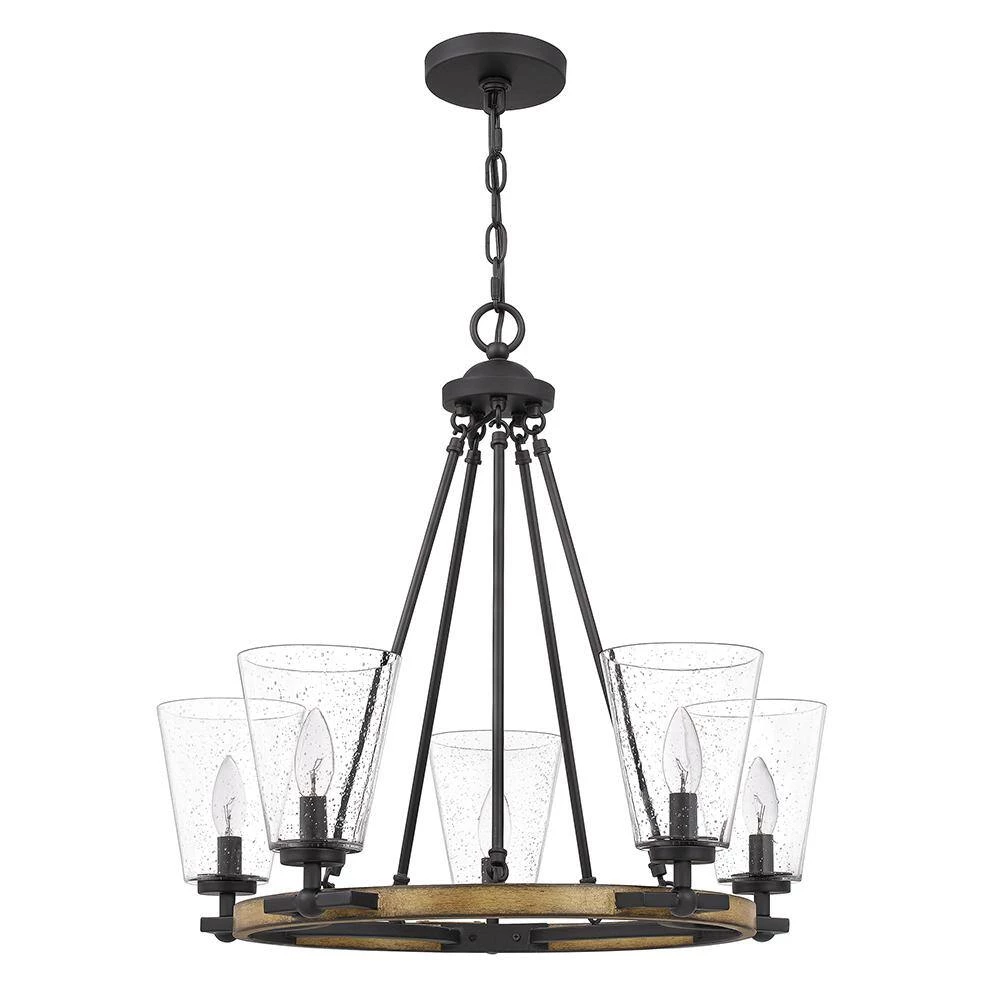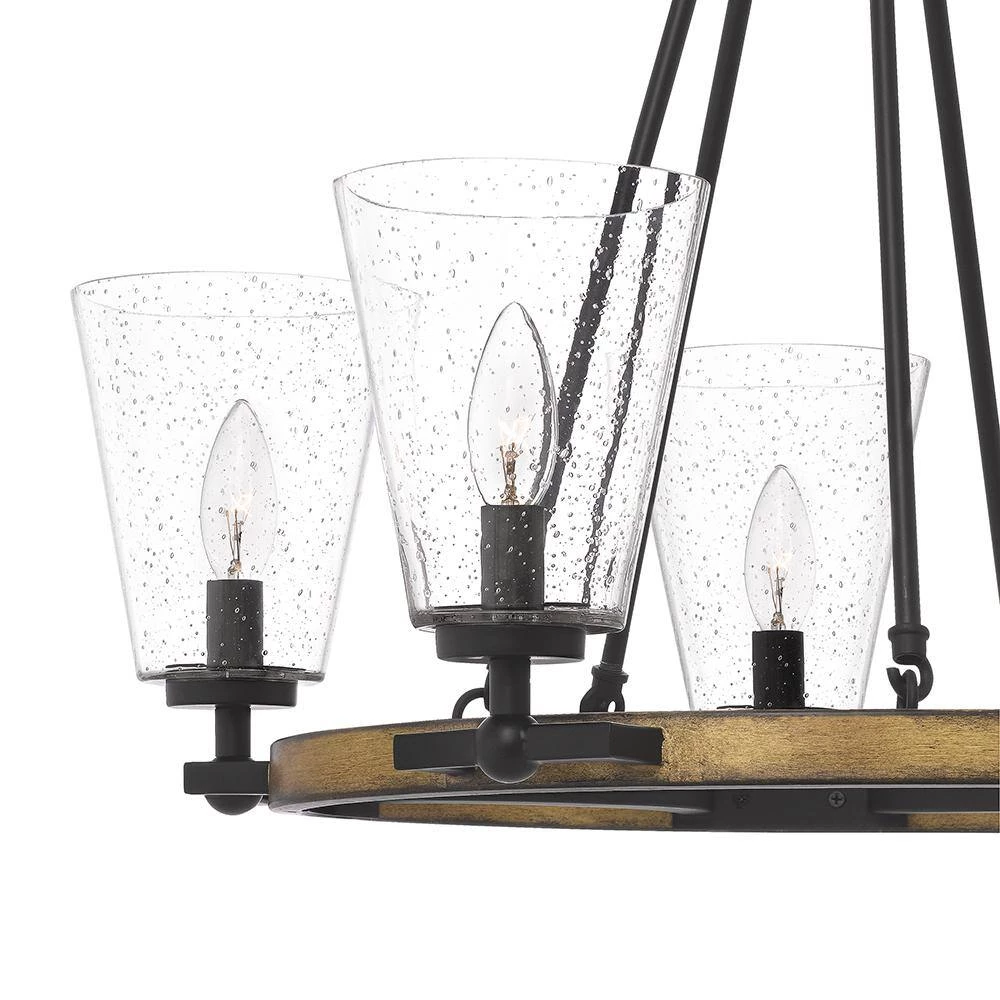 The farmhouse flair of the Hearst collection will be the perfect addition to your home. Finished in Matte Black and paired with a painted Aged Walnut wood finish, the wagon wheel silhouette adds a charming feel to your home decor. The clear seedy glass shades add texture and diffuse the light creating a warm, soft glow.