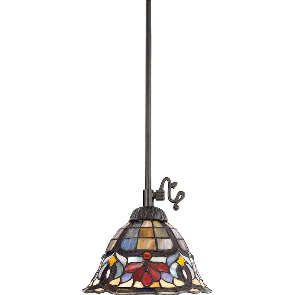 An absolutely breathtaking art glass design that is sure to impress. Features genuine handcrafted art glass in soft greens and creams accented with crimson and blue and arranged in a classic Art Nouveau pattern. Diamond shaped Quoizel Prismstones add even more dimension and texture to the design.