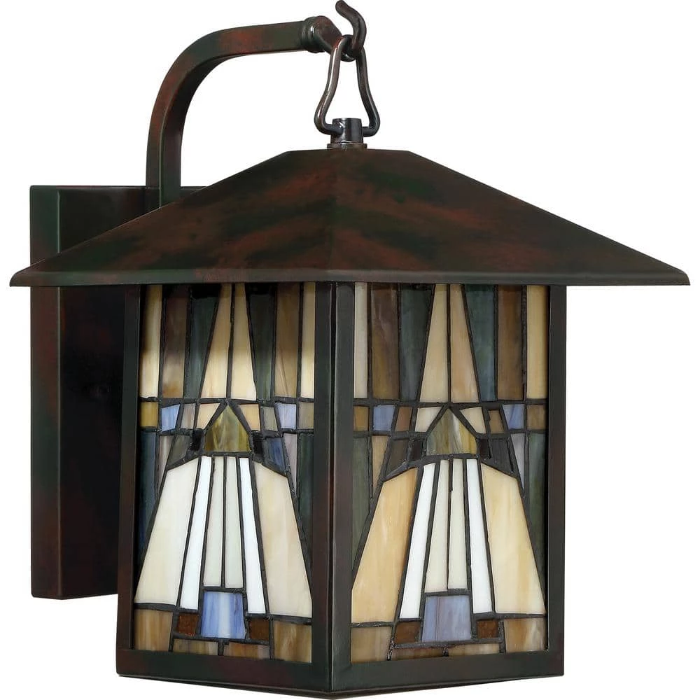 A classic geometric arts & crafts piece with handcrafted art glass in shades of sapphire blue, warm honey, amber and cream. Arts and Crafts is an enduring style that honors the tradition of fine craftsmanship and attention to detail. Inglenook outdoor wall lanterns embrace this style and add unique curb appeal to your home’s exterior.