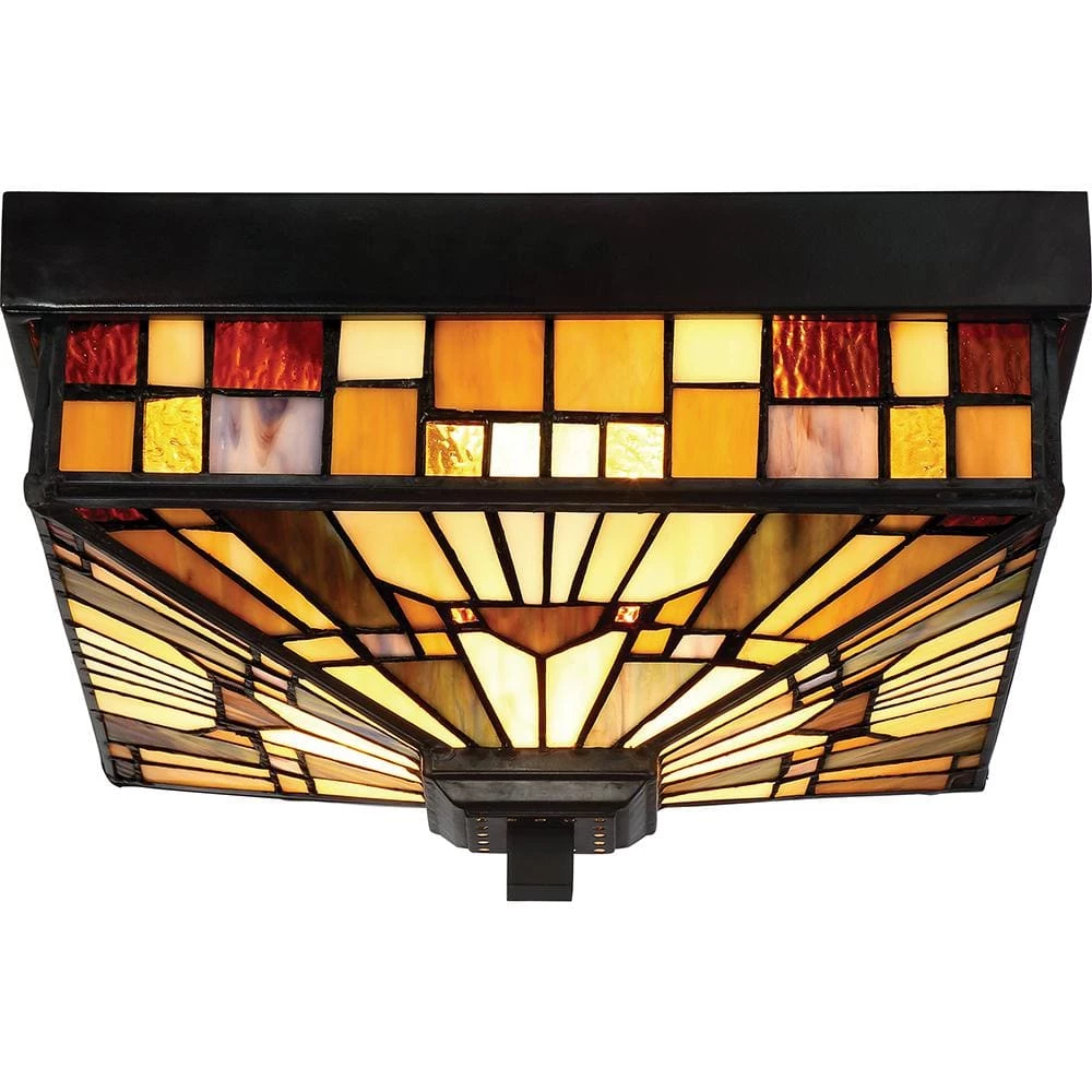 A classic geometric Arts & Crafts piece with handcrafted art glass in shades of sapphire blue, warm honey, amber and cream. Arts and Crafts is an enduring style that honors the tradition of fine craftsmanship and attention to detail. This fixture is dimmable when paired with dimmable bulbs.
