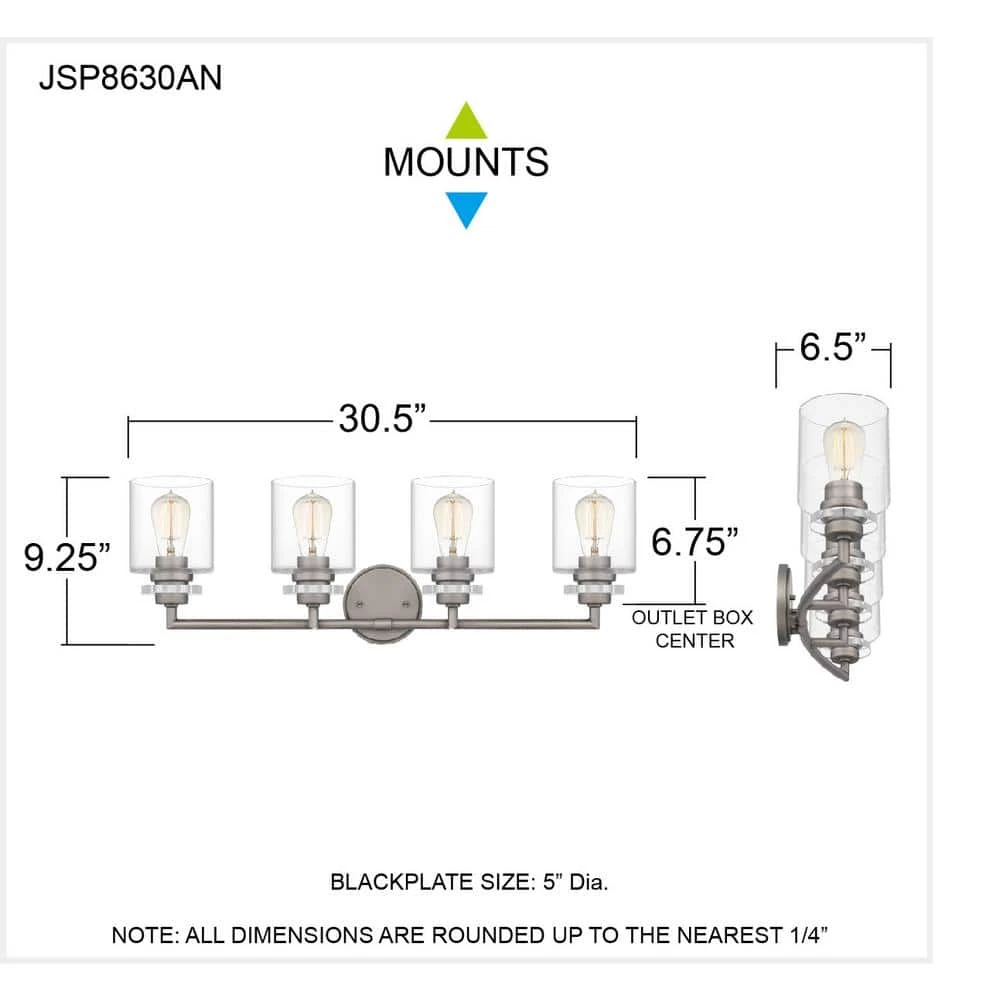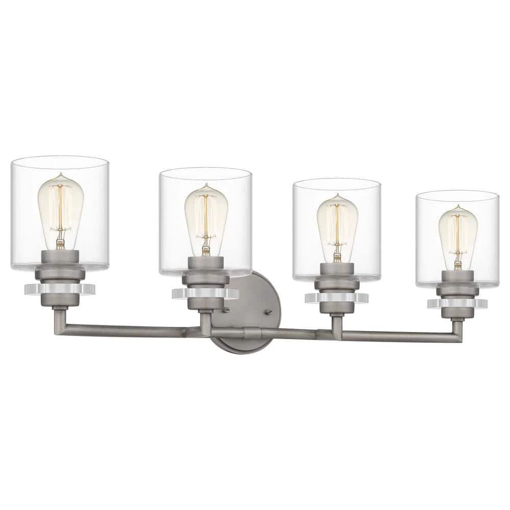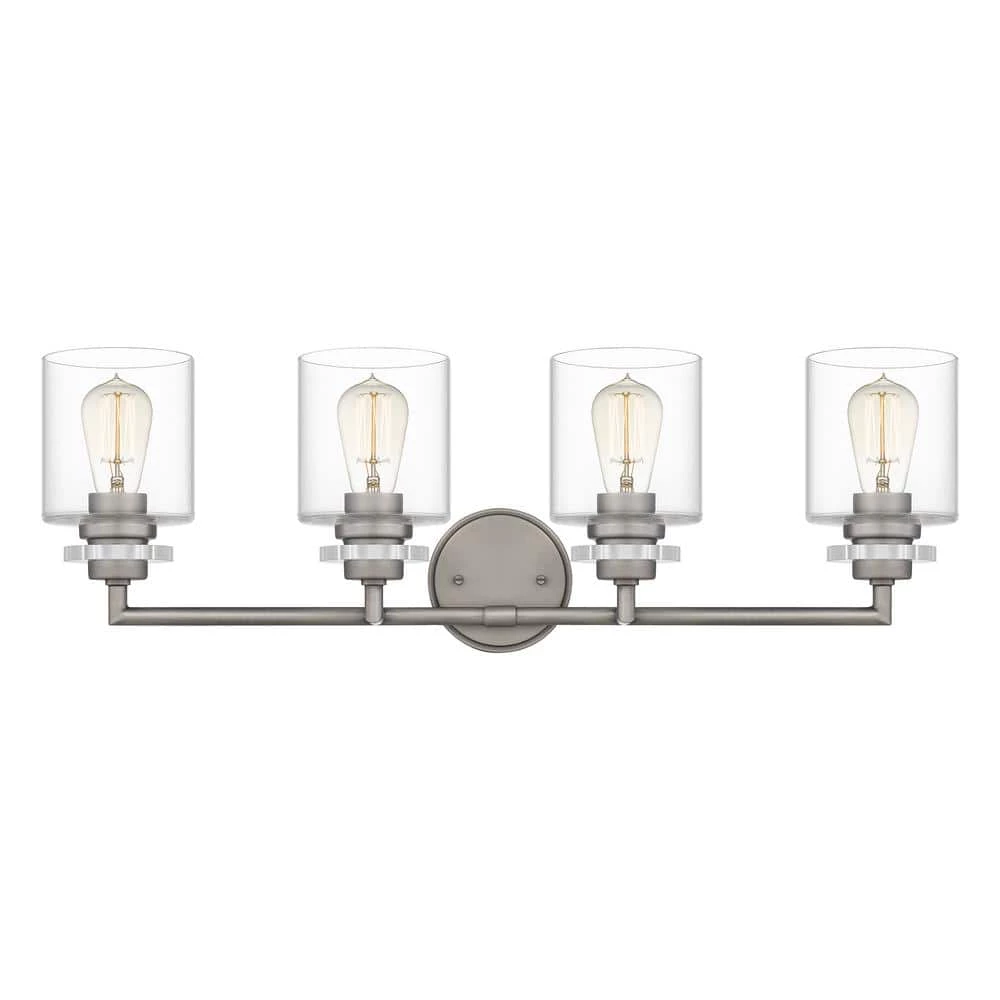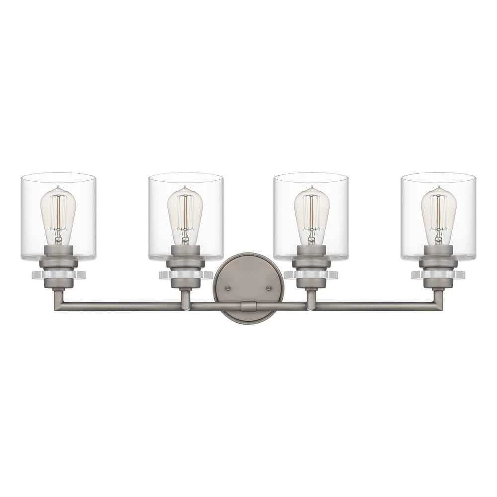Choose two, three or four bulbs in the Jaspar bath light to fit your bathroom’s space and style. Clear glass shades maximize light in a simple, cylindrical shape. An antique nickel finish offers a touch of cool-toned shine.