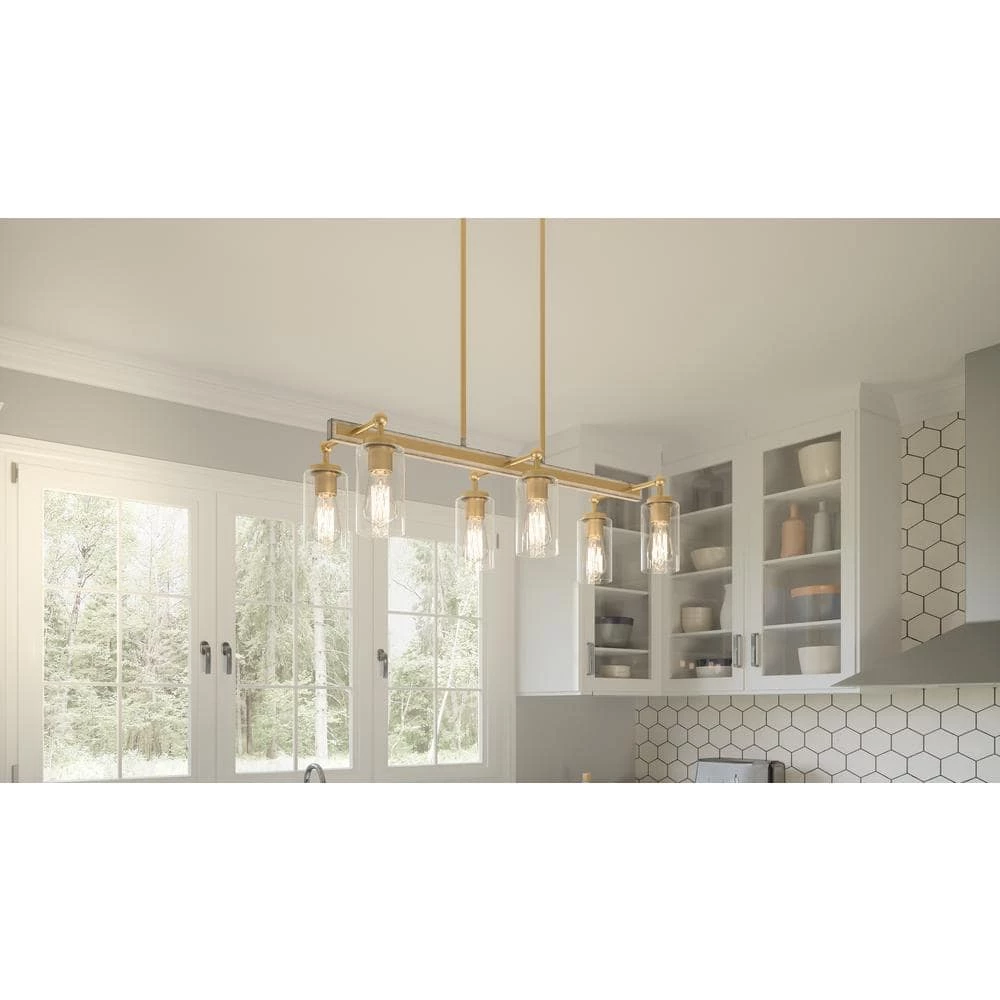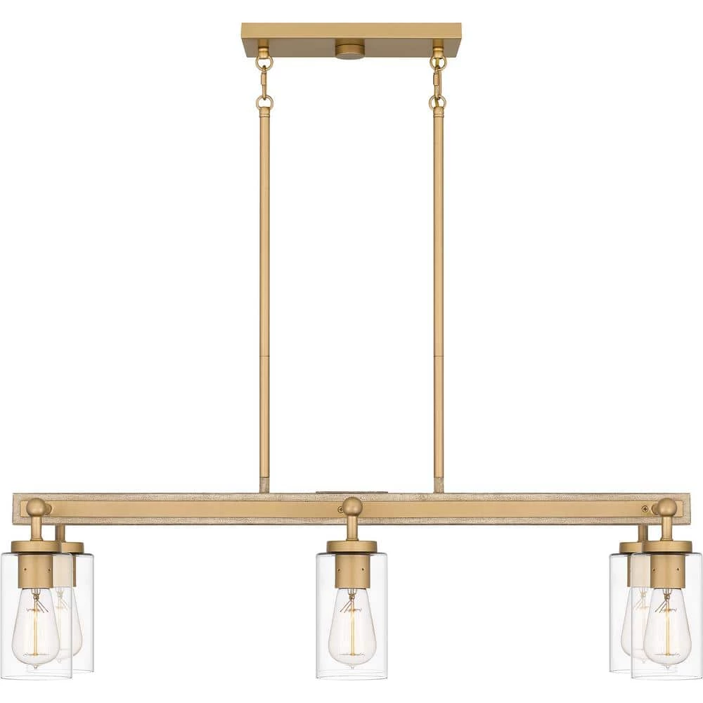 Available as a chandelier or island light, Kelleher is meant to add shine and drama indoors and out. For strictly indoor use, choose the nouveau painted weathered brass finish – highlighted by latte wood finish accents and gold detailing. For outdoor use, choose the distressed iron finish for a bold look designed for a patio or porch.