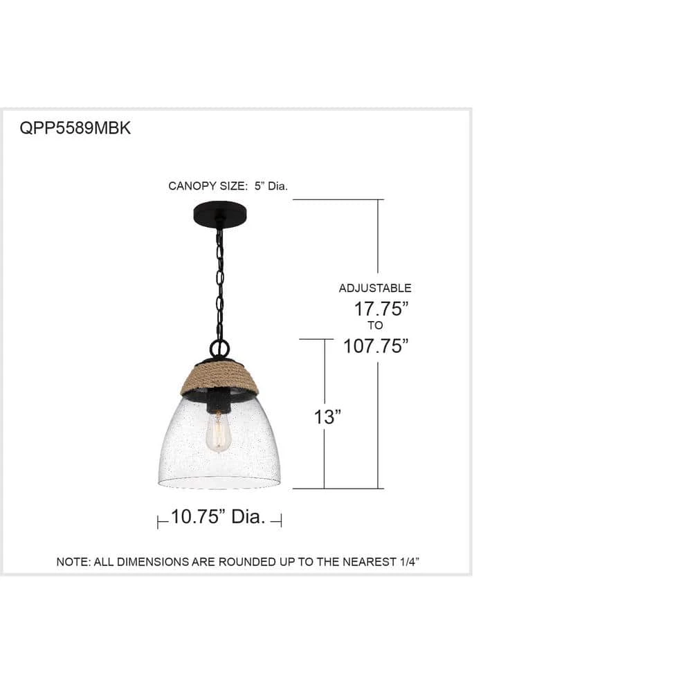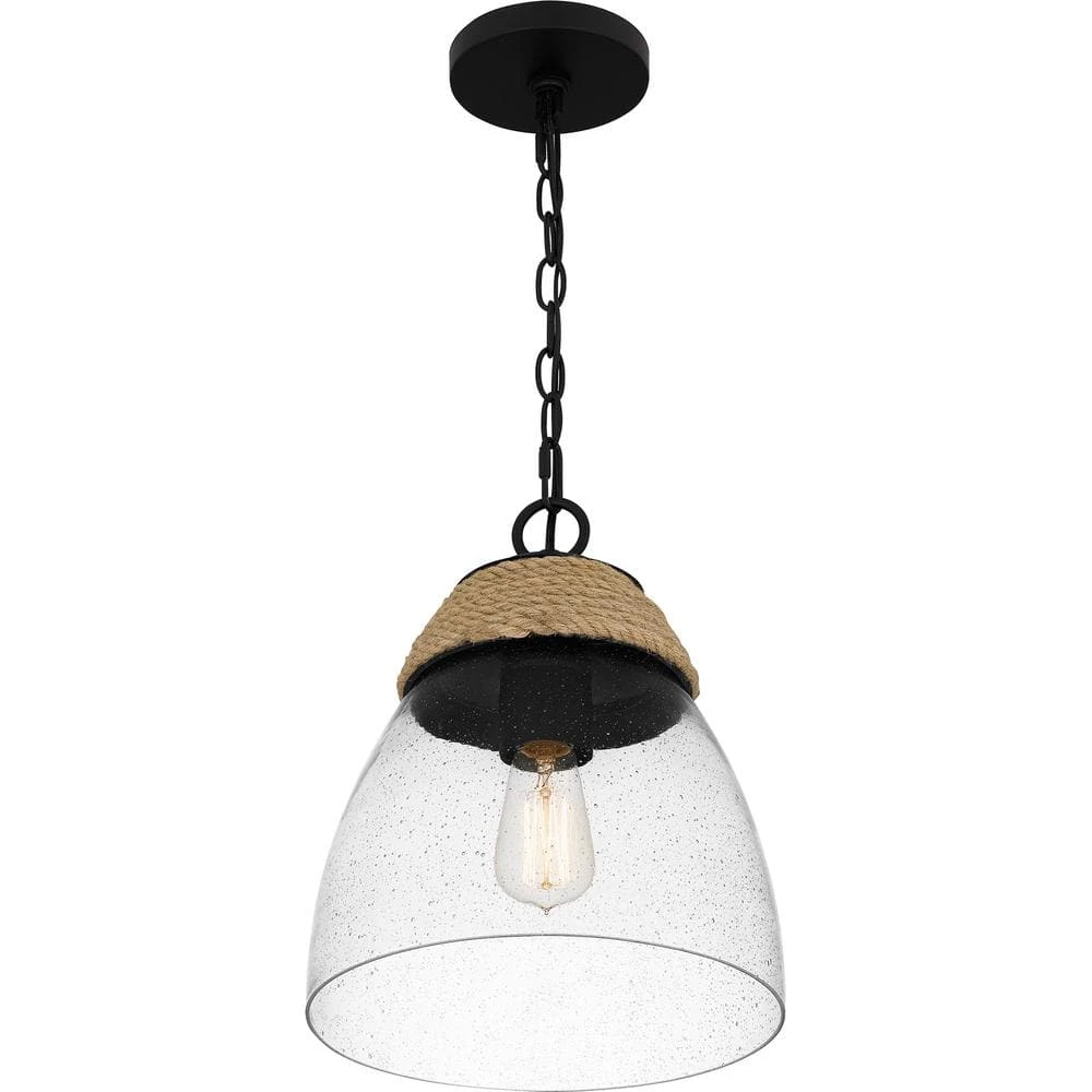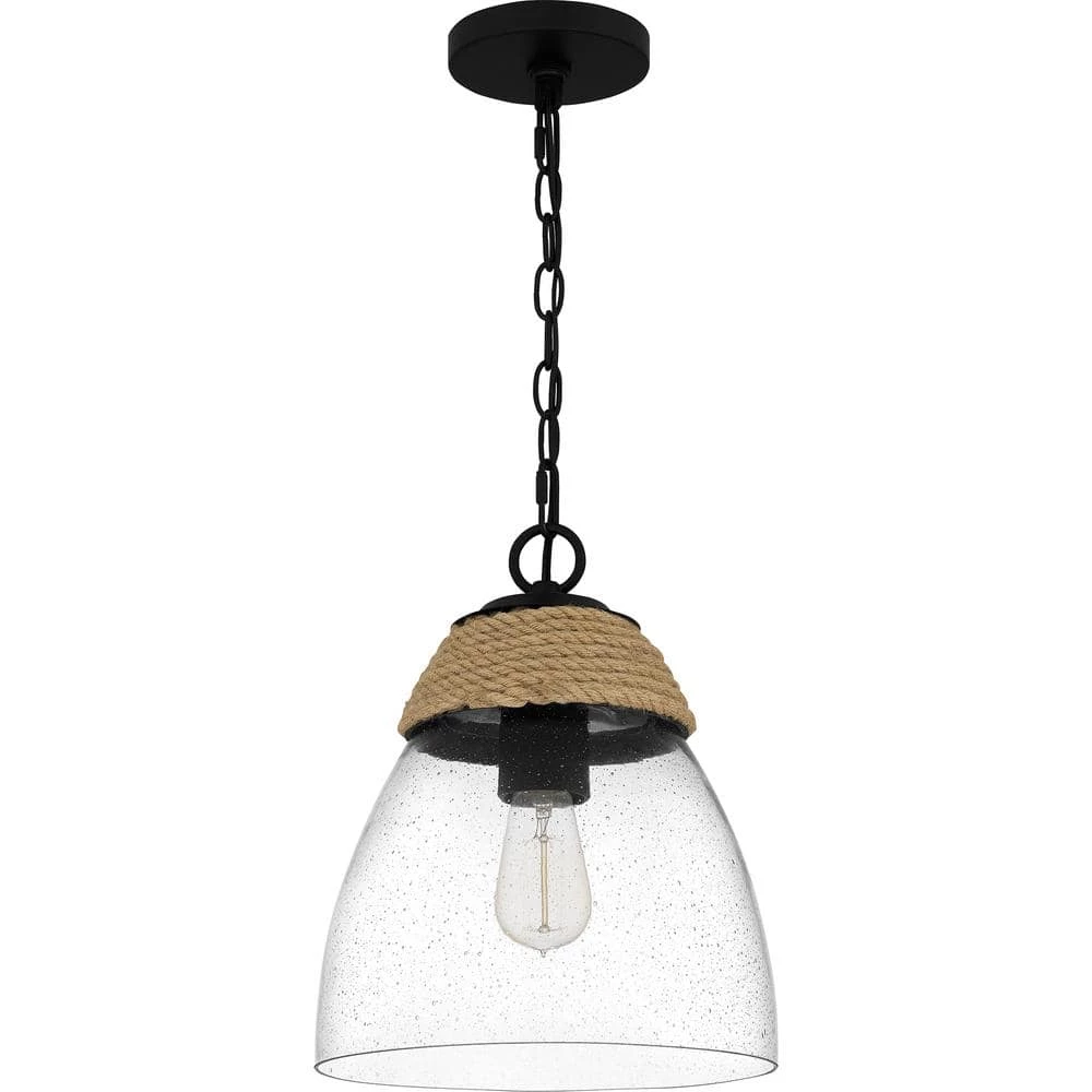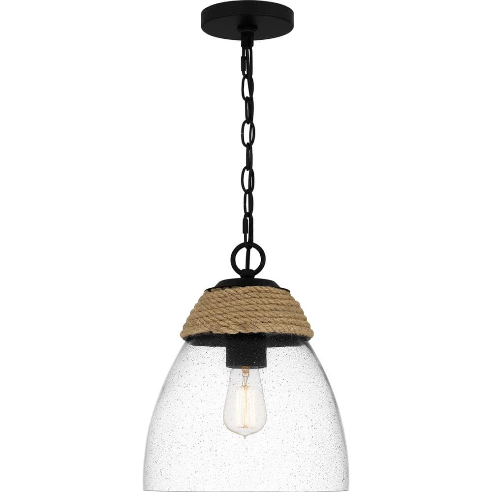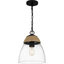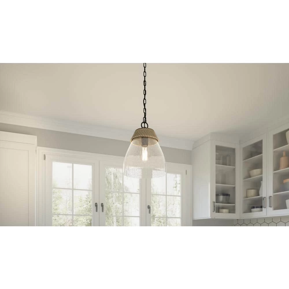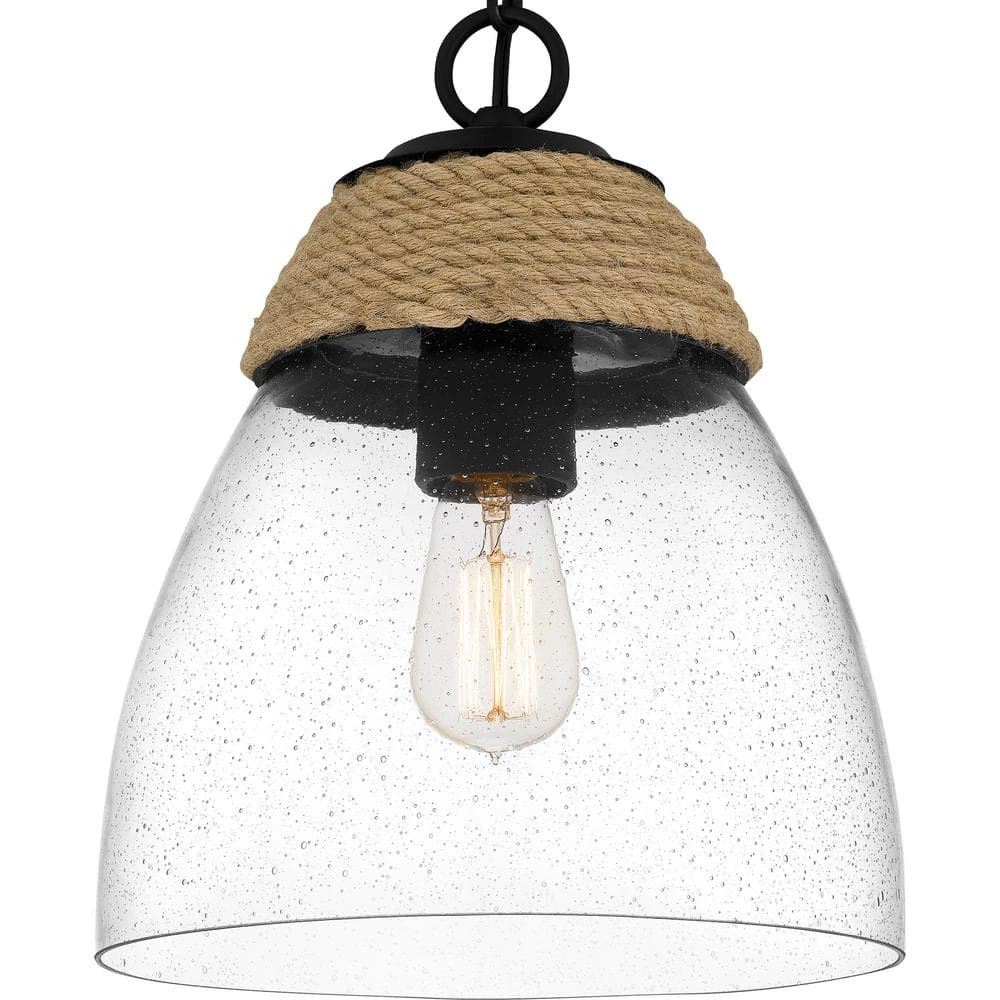 The Kingstide mini pendant evokes the feel of a seaside cottage. Featuring natural rope detailing and a clear seeded glass shade, this design hangs from a matte black chain. Use it anywhere you want to add comfortable, casual charm.