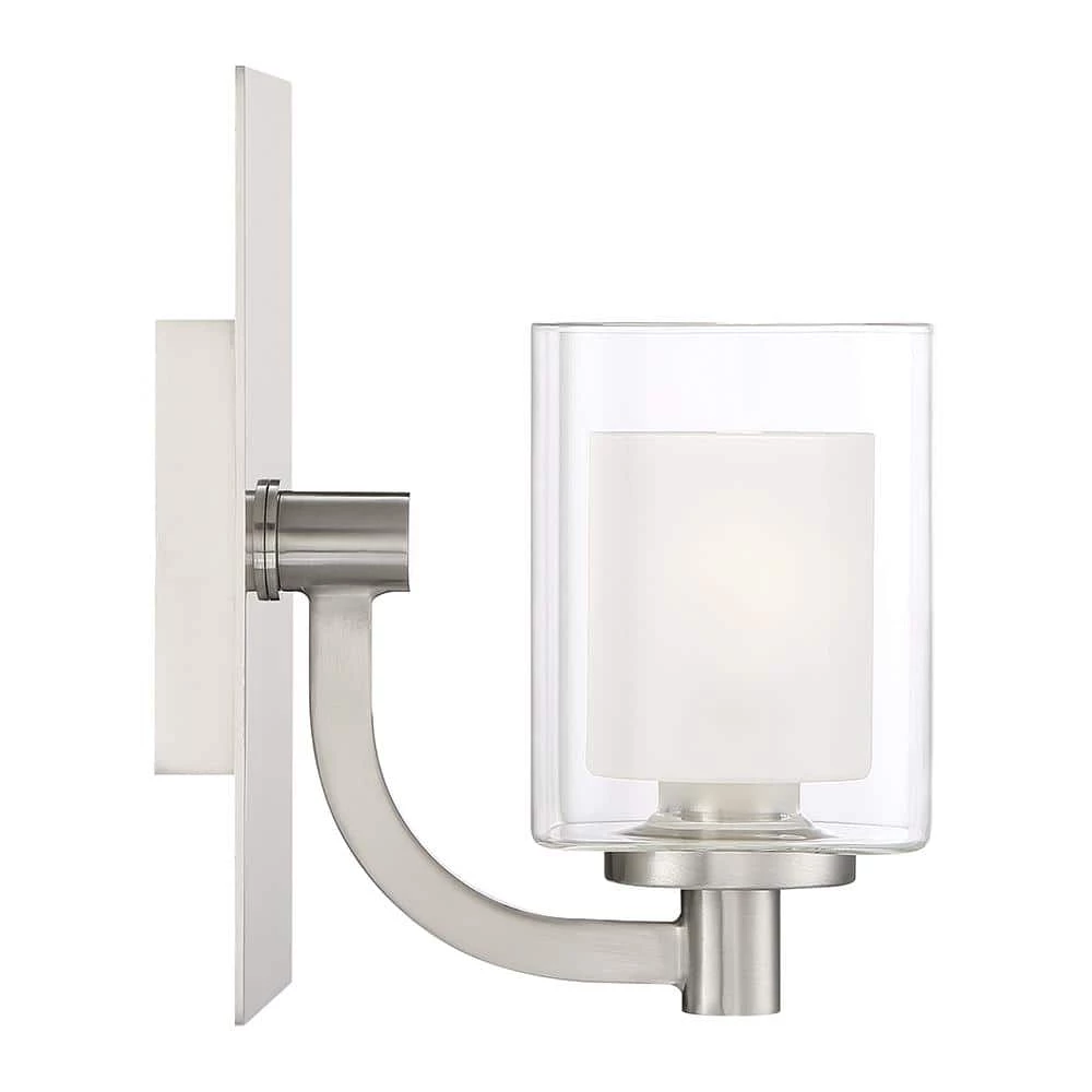 This modern posh collection features a simplistic design with a brushed nickel finish. The inner heavy glass is sand-blasted inside and encased within outer clear glass for a sophisticated and stunning look. This fixture is ETL listed for use in damp locations.