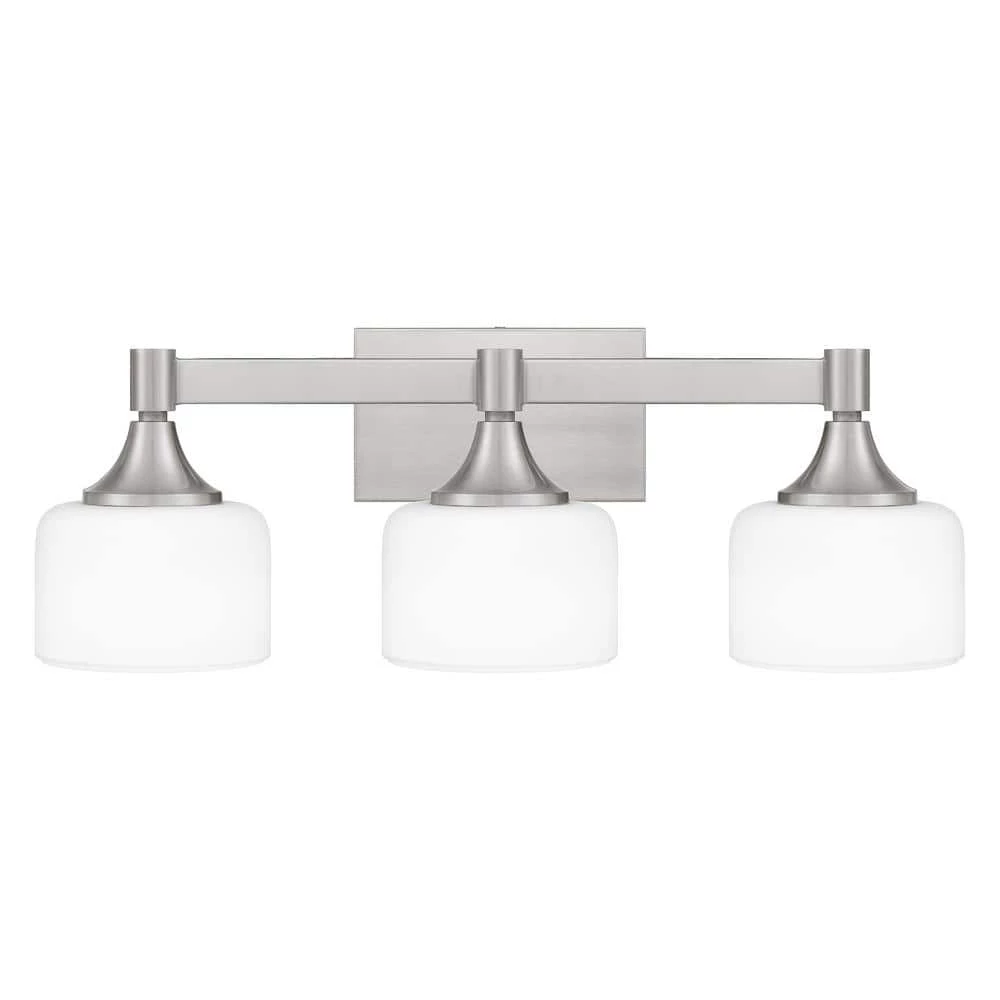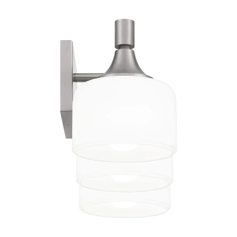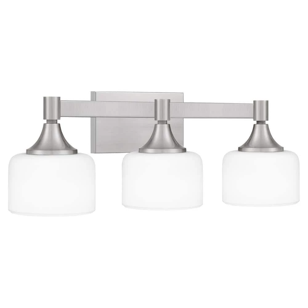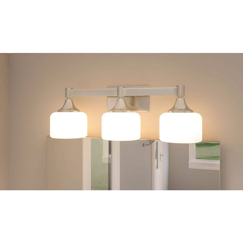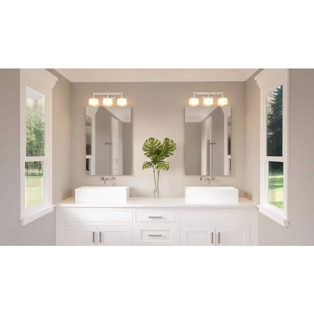 Elevate your bathroom with the Ladson collection. The oversized sockets and brushed nickel finish make this soft contemporary design the perfect addition to any bathroom. The opal etched glass shades contrast the metal frame and enhance the overall appearance of the fixture. This collection can be hung as an uplight or downlight depending on your preference.