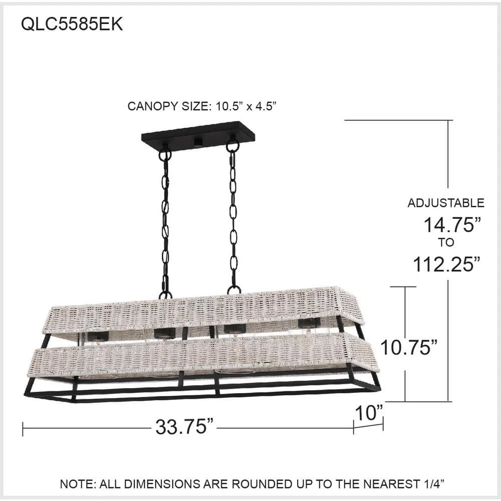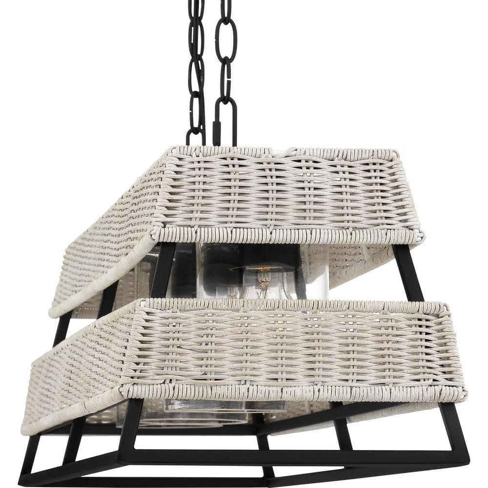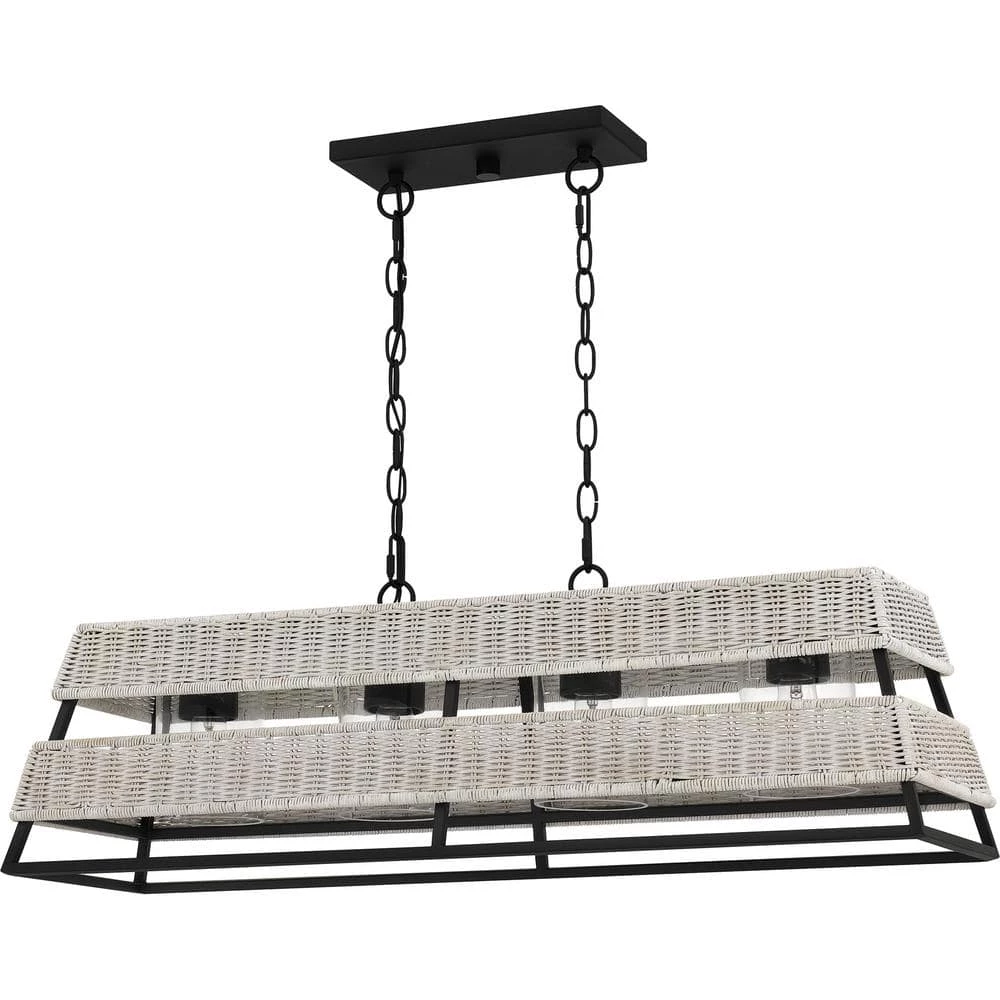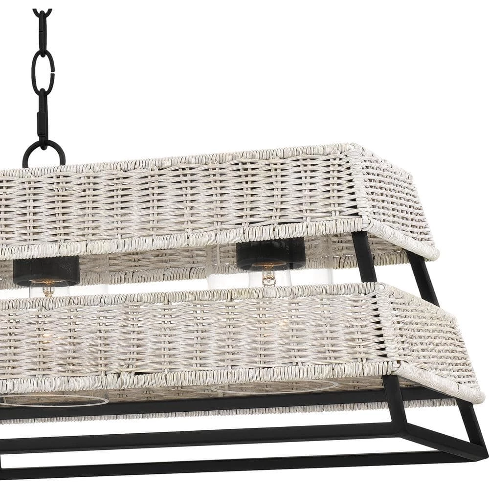 The Lowenthal linear chandelier pairs an earth black finish with textured white accents. 2 tiers of wicker allow light to peek through, thanks to 4 candles with clear glass shades. This layered design offers eclectic style with a touch of coastal cool. Designed for outdoor use, Lowenthal makes the perfect focal point in any porch or patio setting.