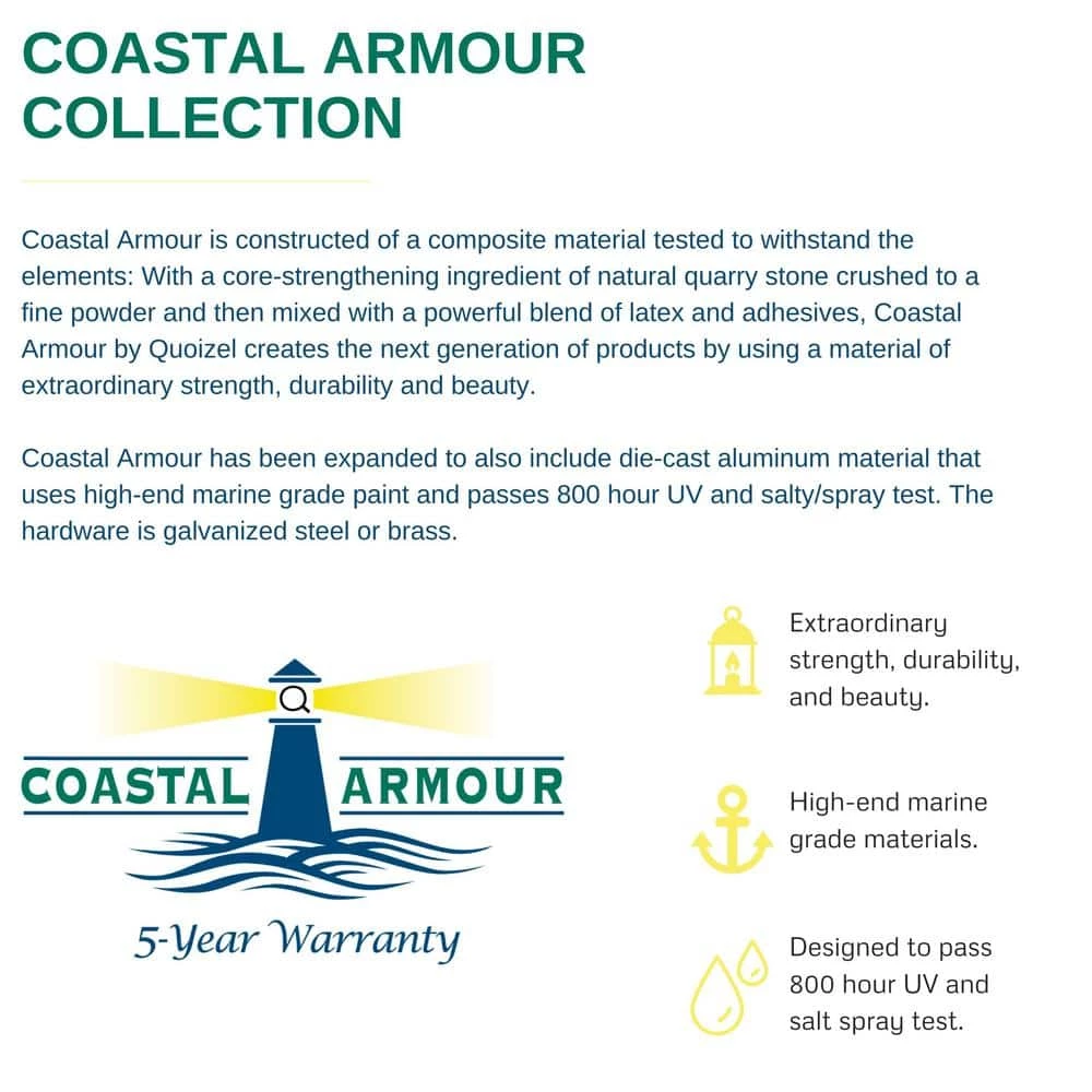 - Coastal Armour is non-corrosive, fade resistant, rust resistant, and carries a 5-year finish warranty
