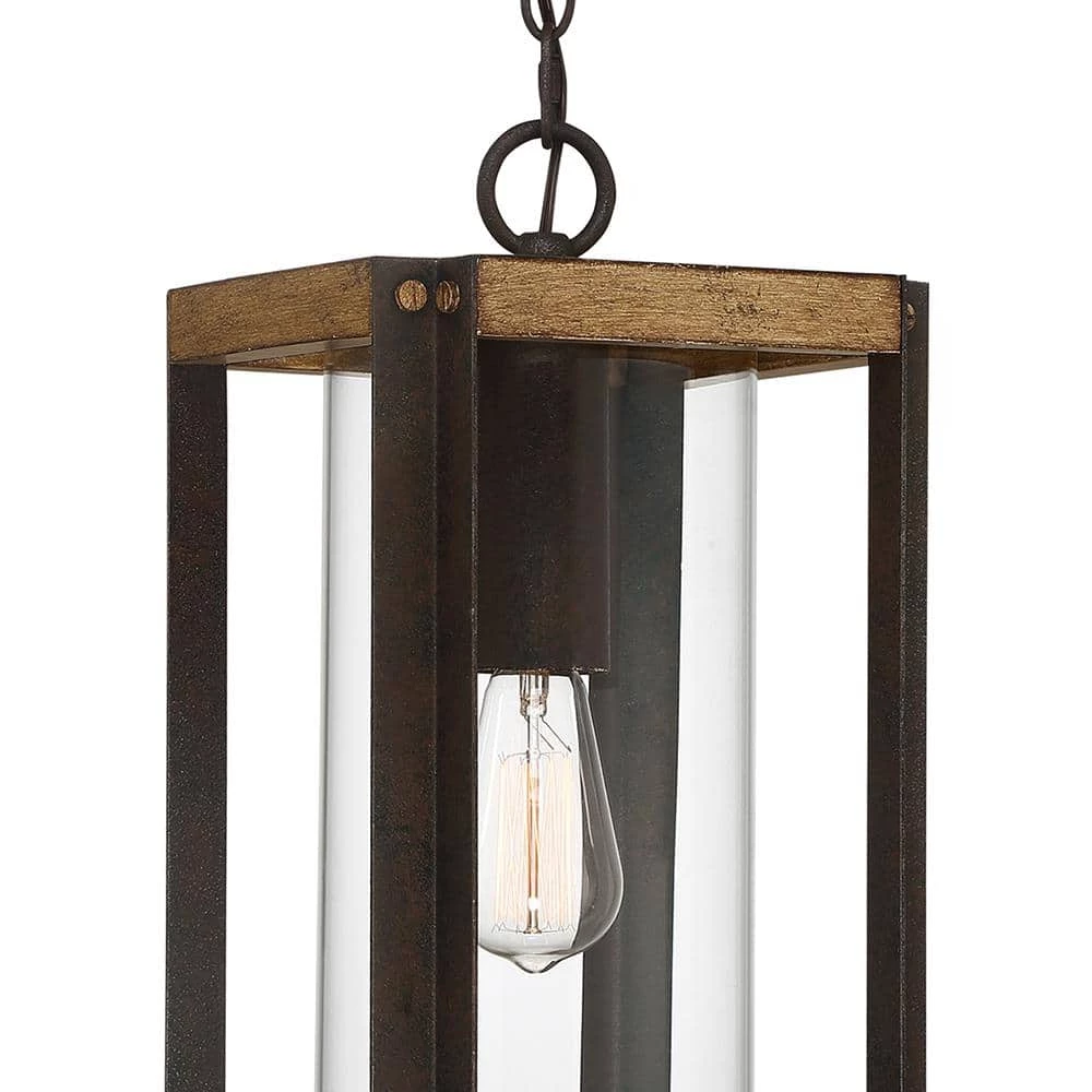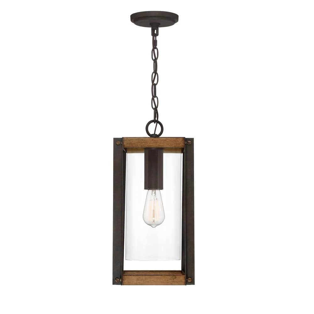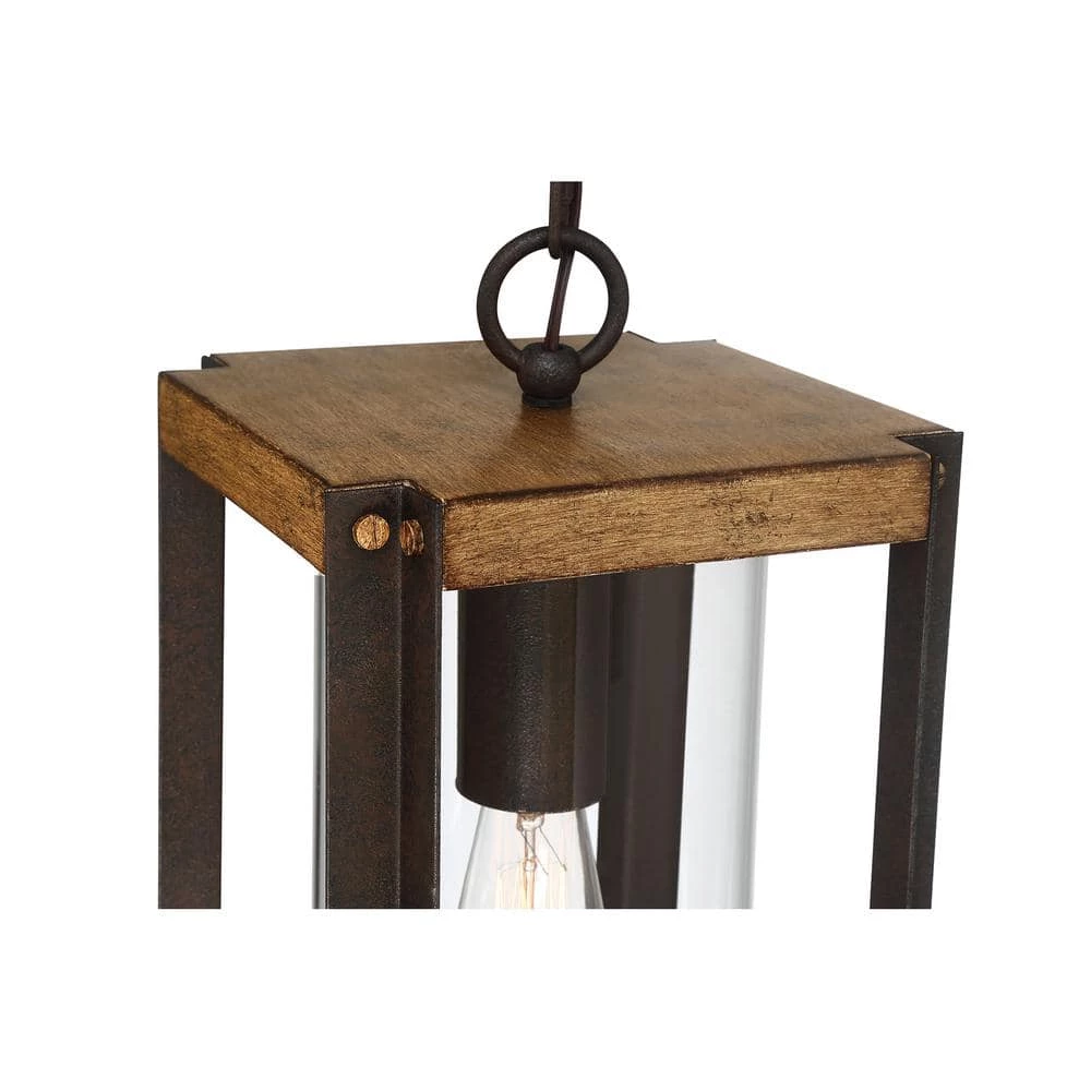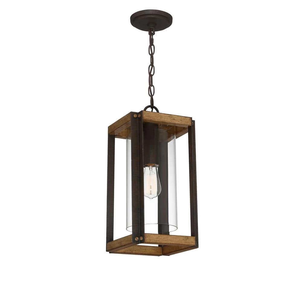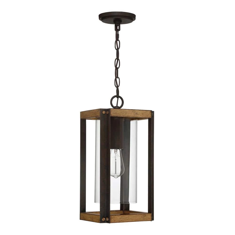 Create a welcoming look for you and your guests with the Marion Square collection. The rectangular silhouette is finished in Rustic Black and complemented by a painted Aged Walnut Wood for a transitional yet rustic style fixture. The open steel frame highlights the clear glass cylindrical shade and evokes a bright light within your home’s exterior.