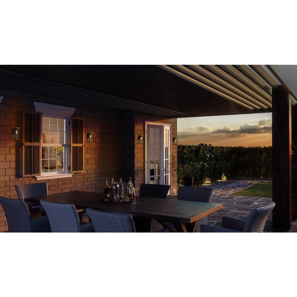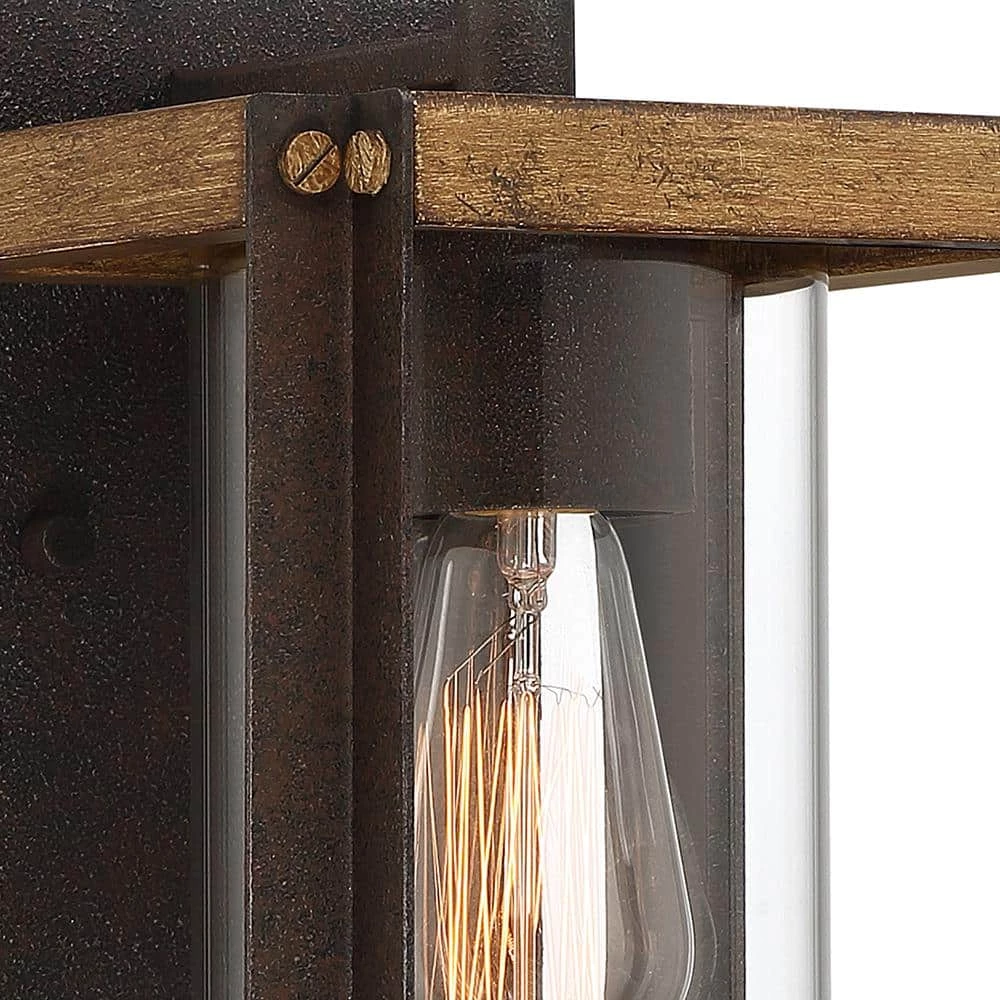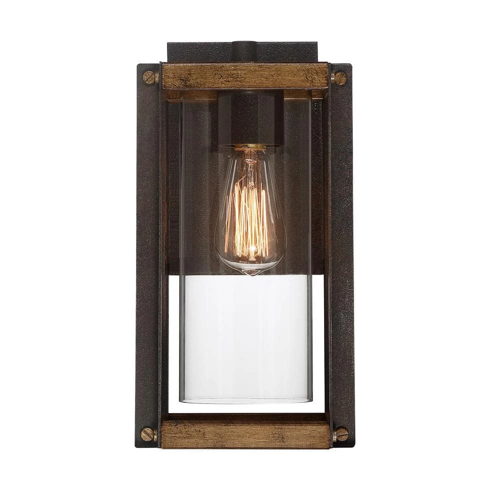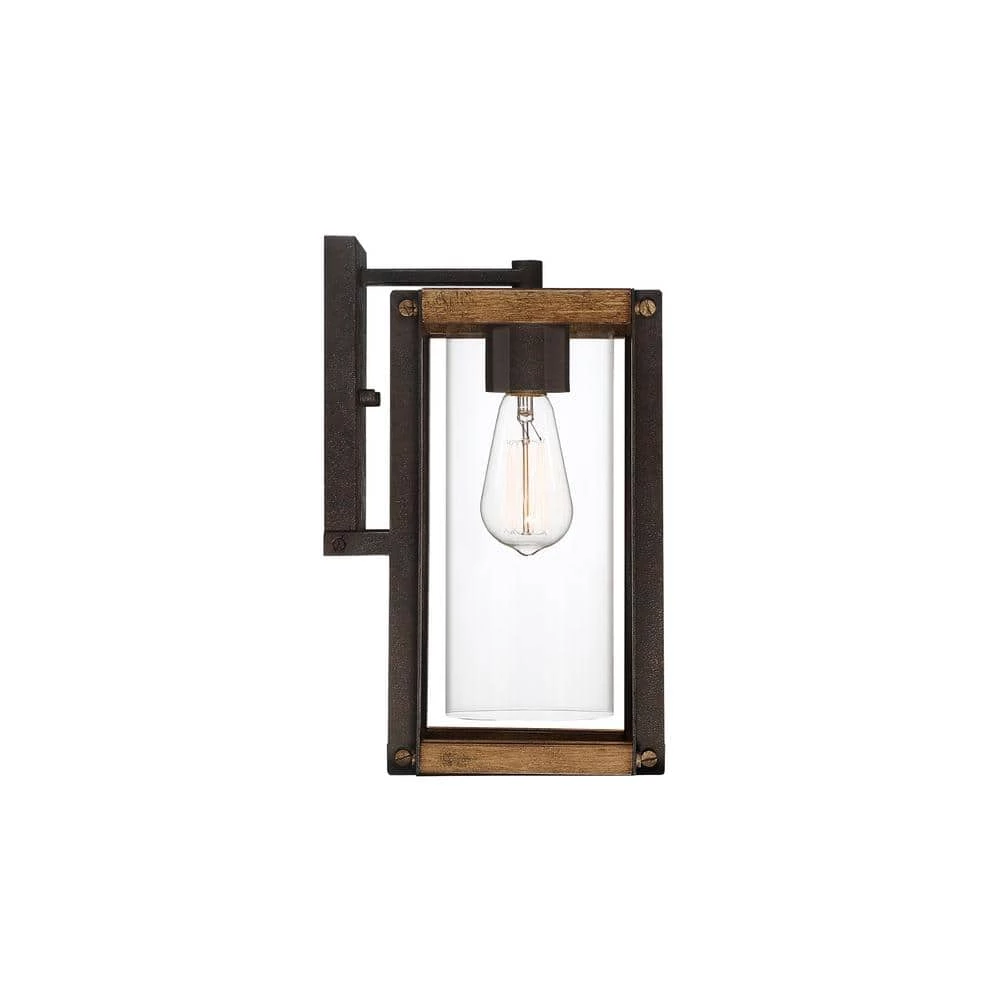 Create a welcoming look for you and your guests with the Marion Square collection. The rectangular silhouette is finished in Rustic Black and complemented by a painted Aged Walnut Wood for a transitional yet rustic style fixture. The open steel frame highlights the clear glass cylindrical shade and evokes a bright light within your home’s exterior.