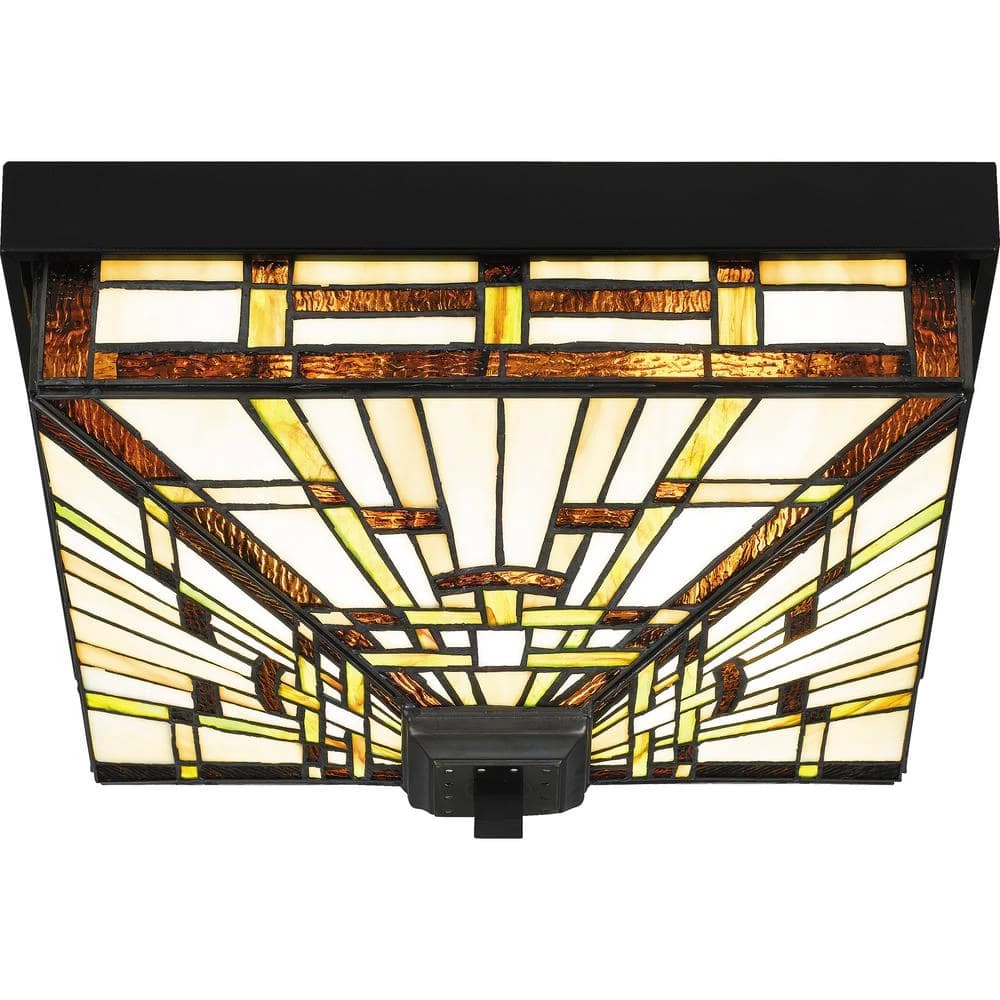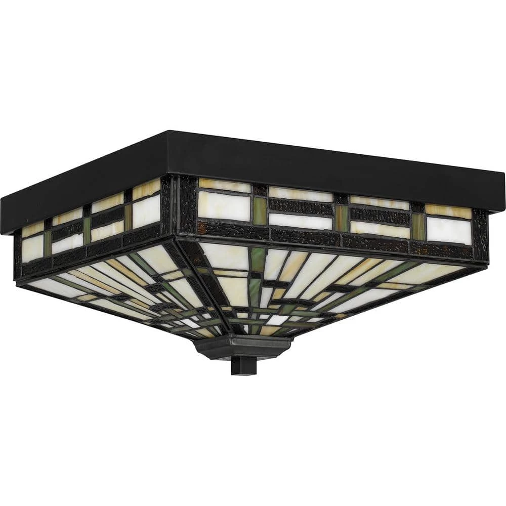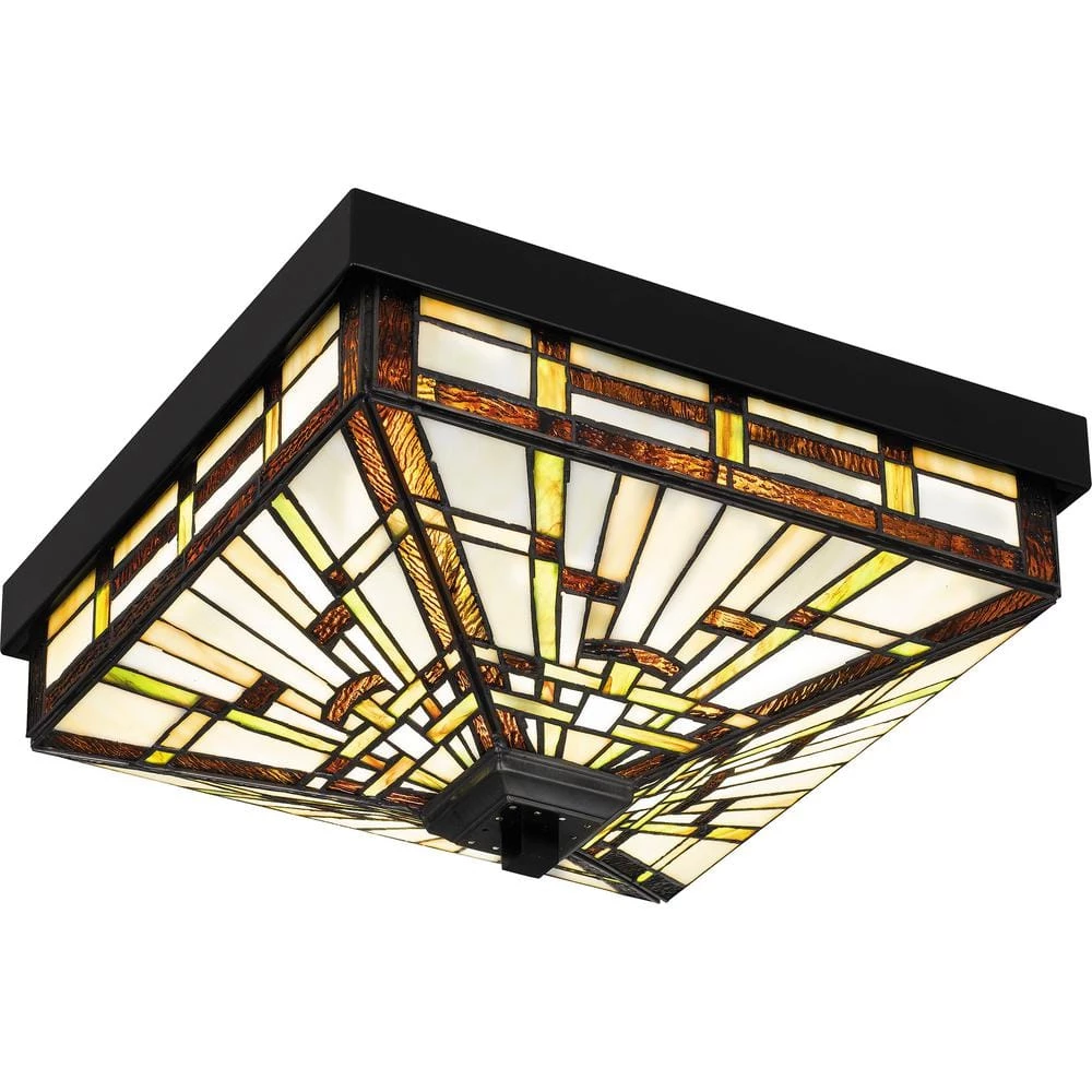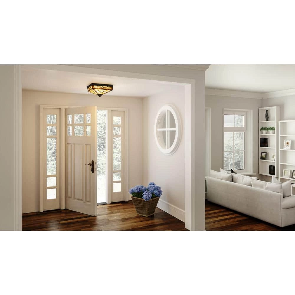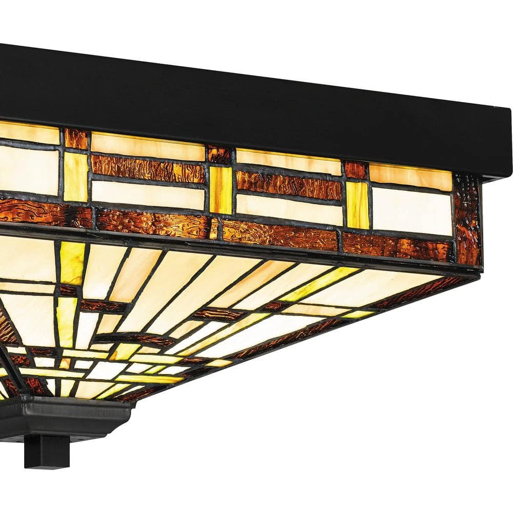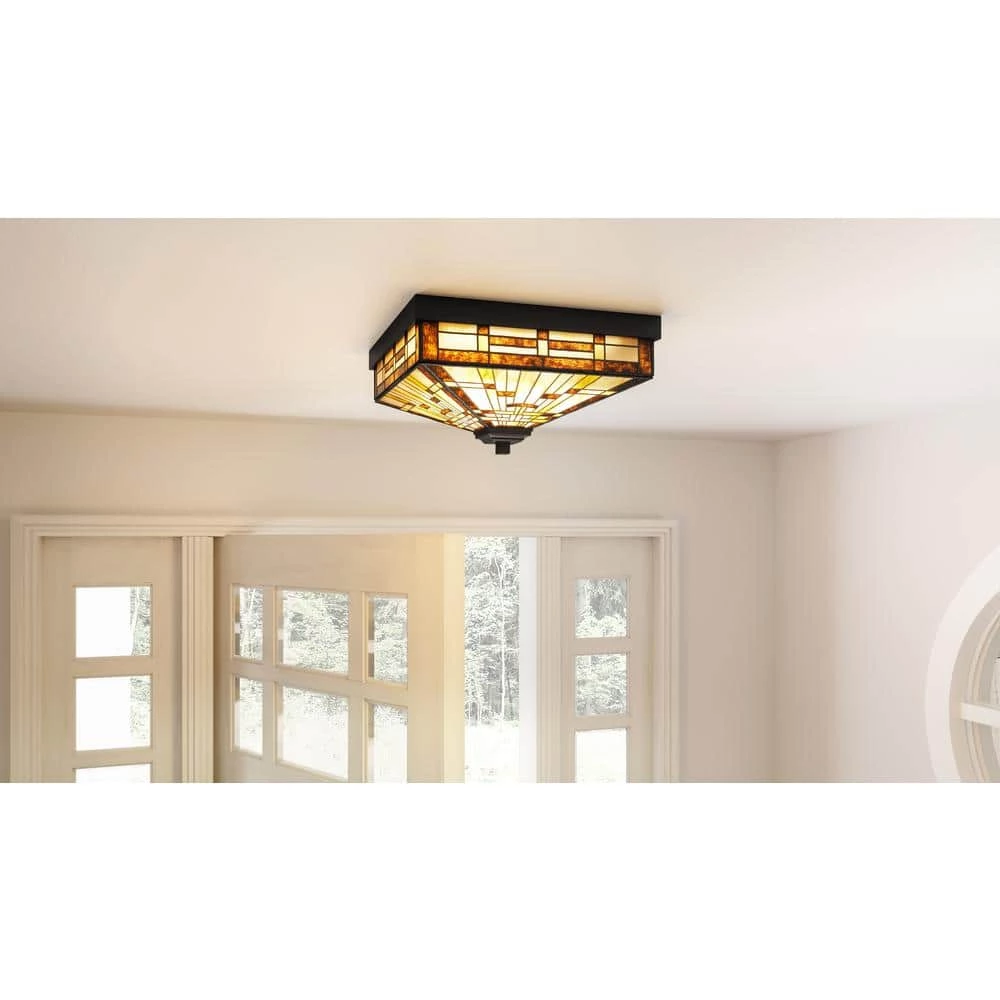 The Mill Run table lamp and flush mount present Craftsmen style in tones of espresso, amber, celery and cream. The table lamp includes hefty pull chains and a simple, handsome base in matte black. The flush mount also features a matte black finish, apparent in a decorative finial.