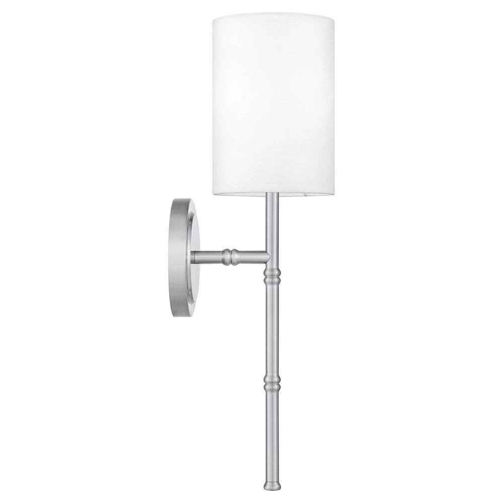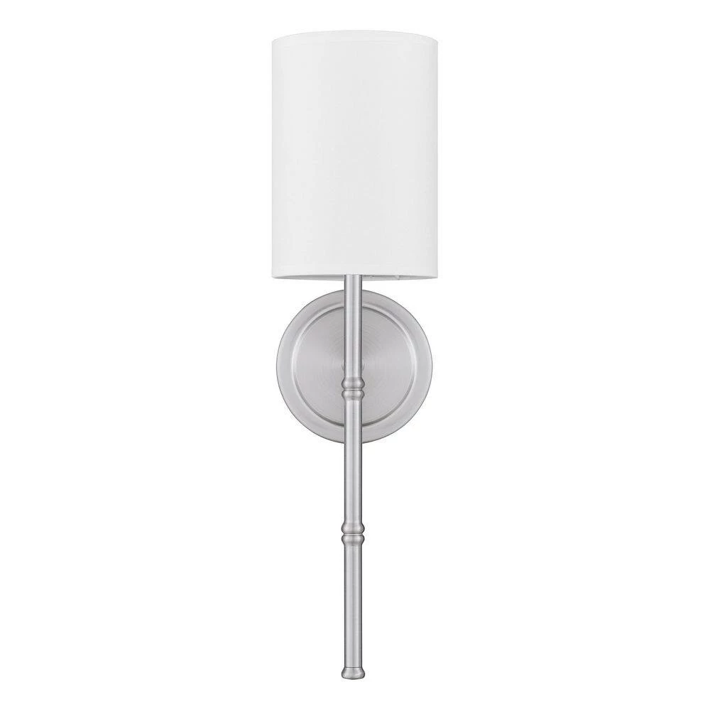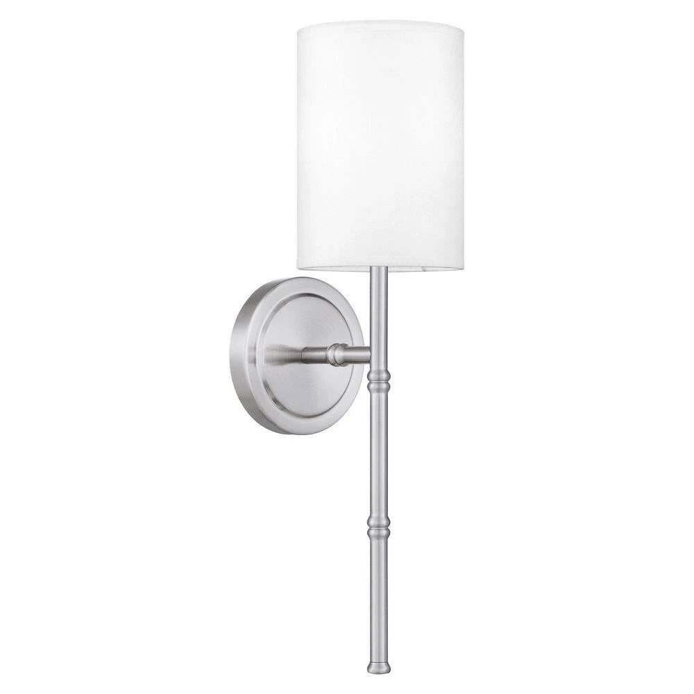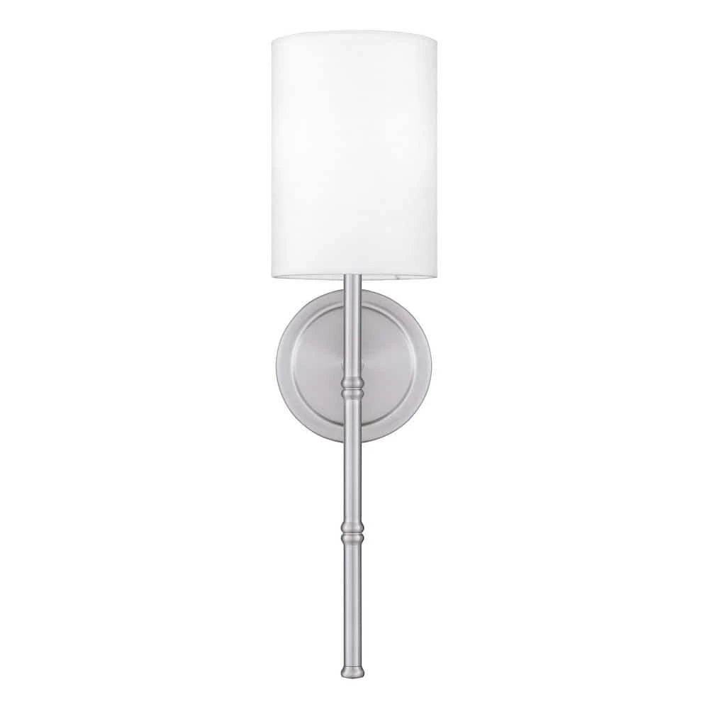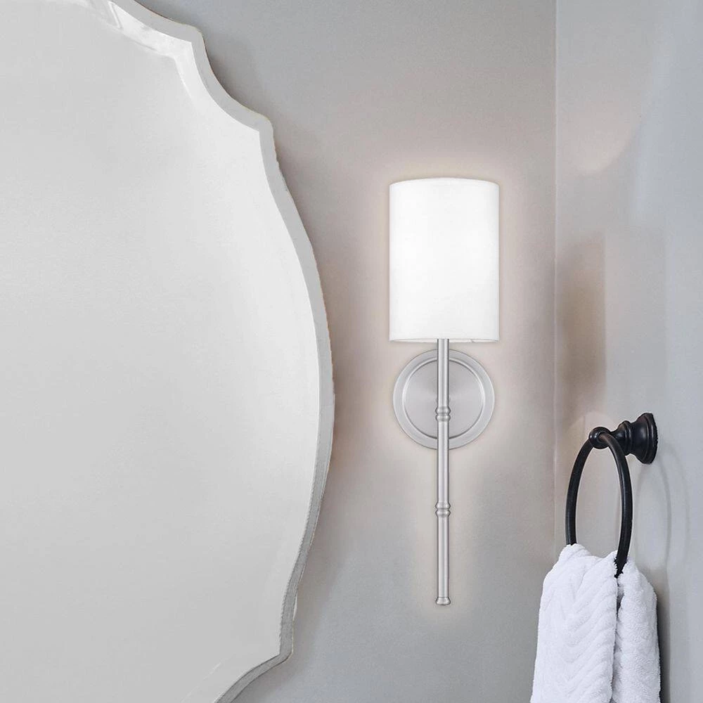 With a subtle nod to Chinoiserie aesthetic, the Monica sconce features a bamboo-like base in aged brass or antique polished nickel. Topped with a white fabric drum shade, Monica illuminates refined, timeless design, upgrading a humdrum powder room to a stylish destination. Fixture is dimmable when paired with dimming-compatible bulbs