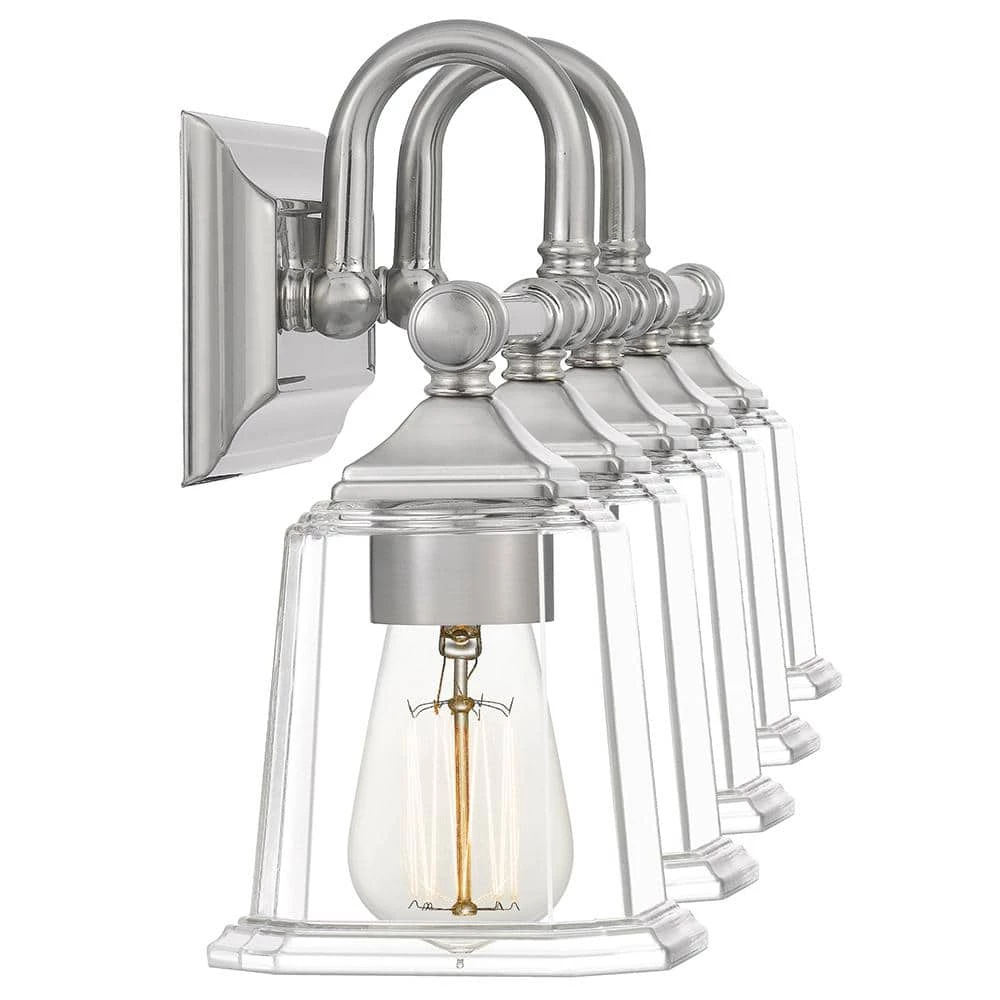 The Nicholas collection gives a solid nod to mid century style. The streamlined silhouette is finished in Brushed Nickel, Polished Chrome, or Earth Black to compliment a variety of home styles. The tapered square glass shades gives this design an edge and it is complemented beautifully by the rectangular backplate. All bath fixtures can be mounted as uplights or downlights and are offered in several sizes.