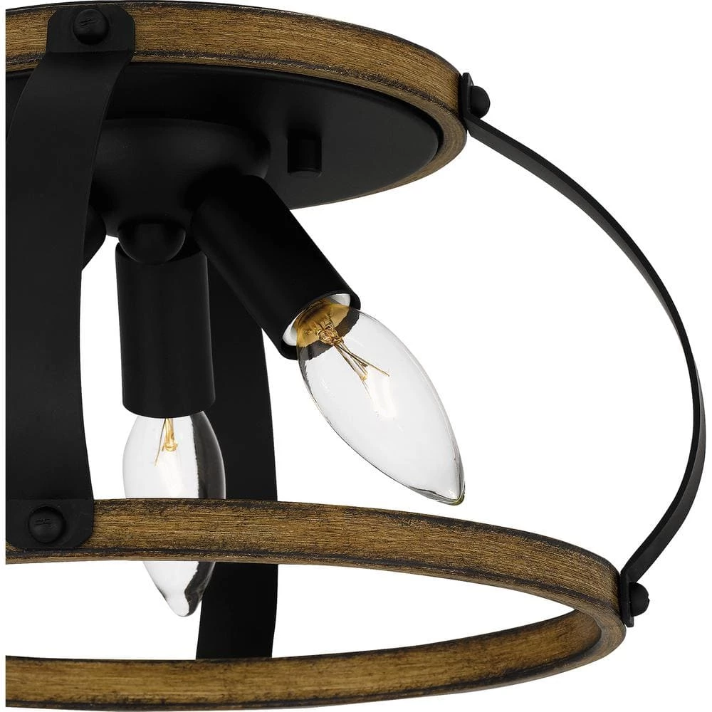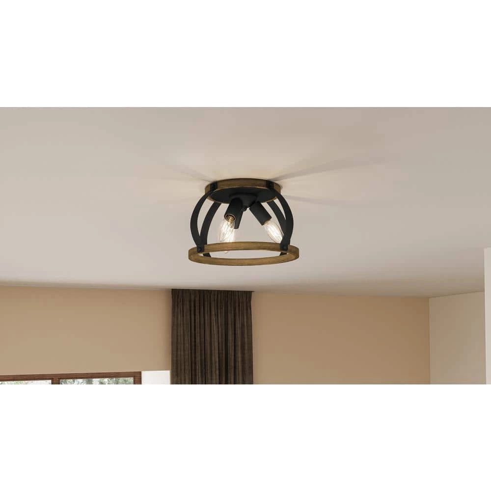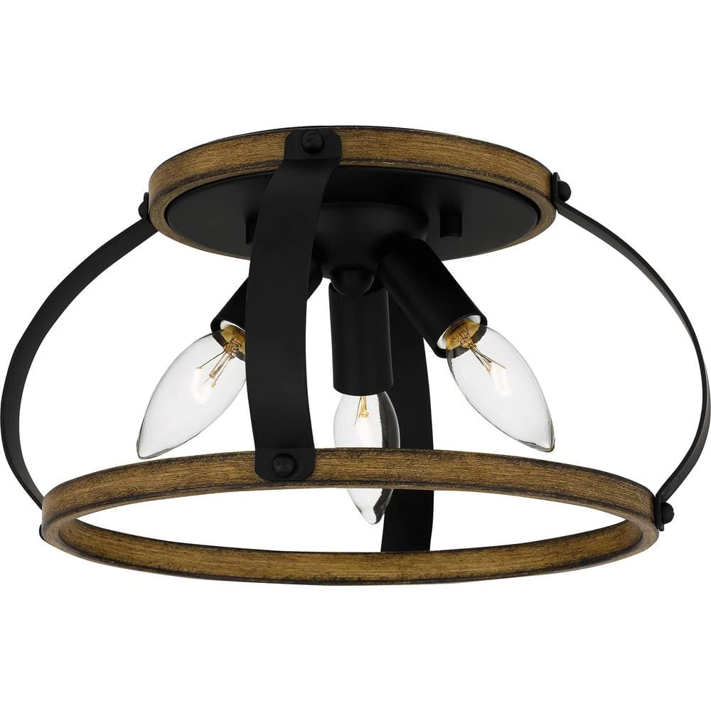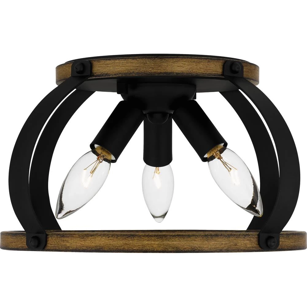 Overbank features weathered wood accents paired with the grounding effect of a matte black finish. This stylish flush mount includes space for 3 bulbs, maximizing light in an entryway or mudroom. Overbank’s clean lines would also enhance a powder room or guest bathroom.
