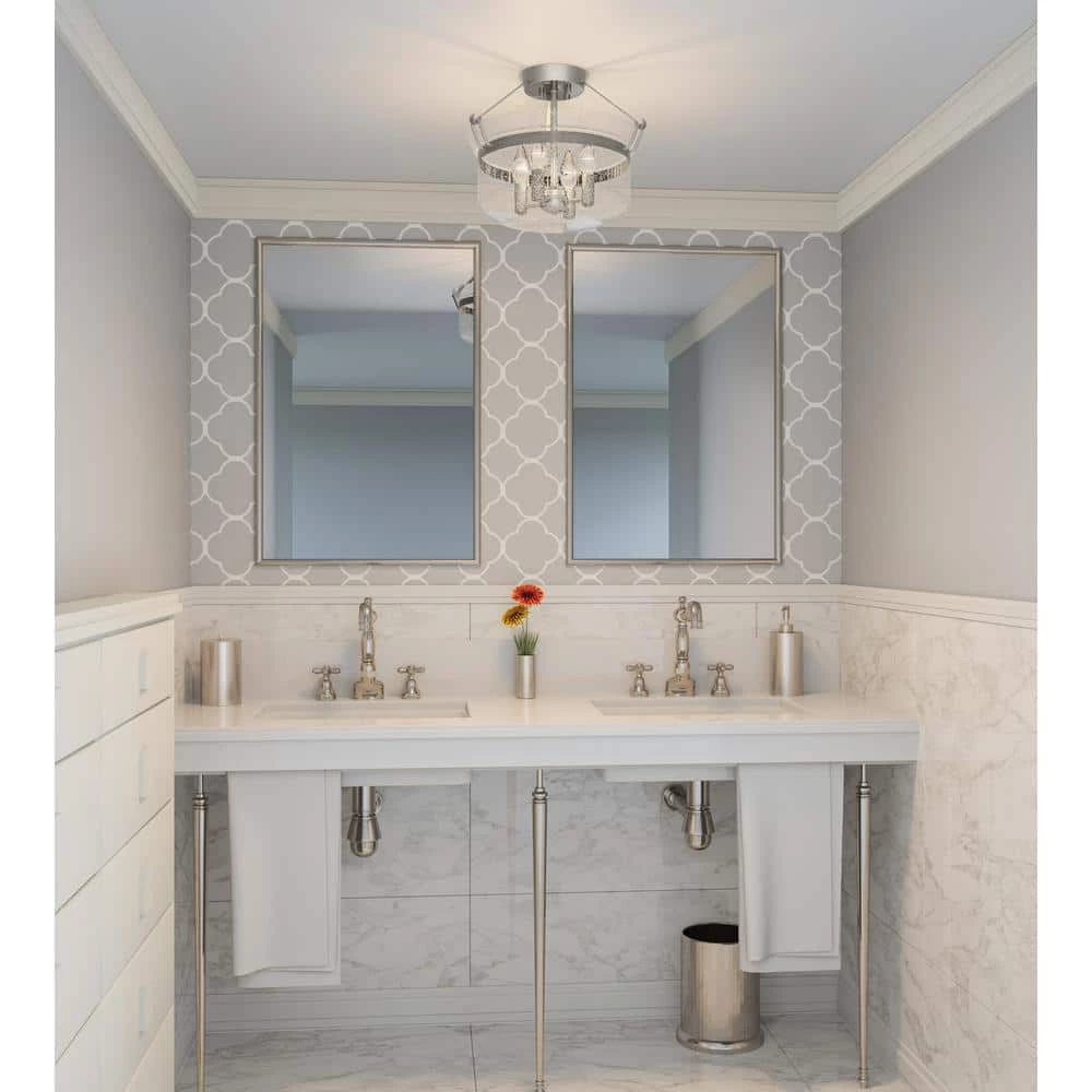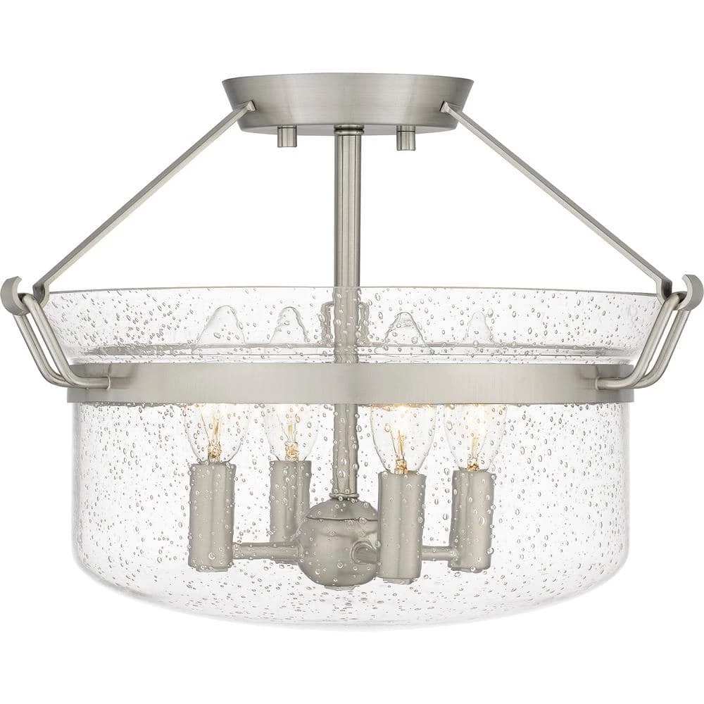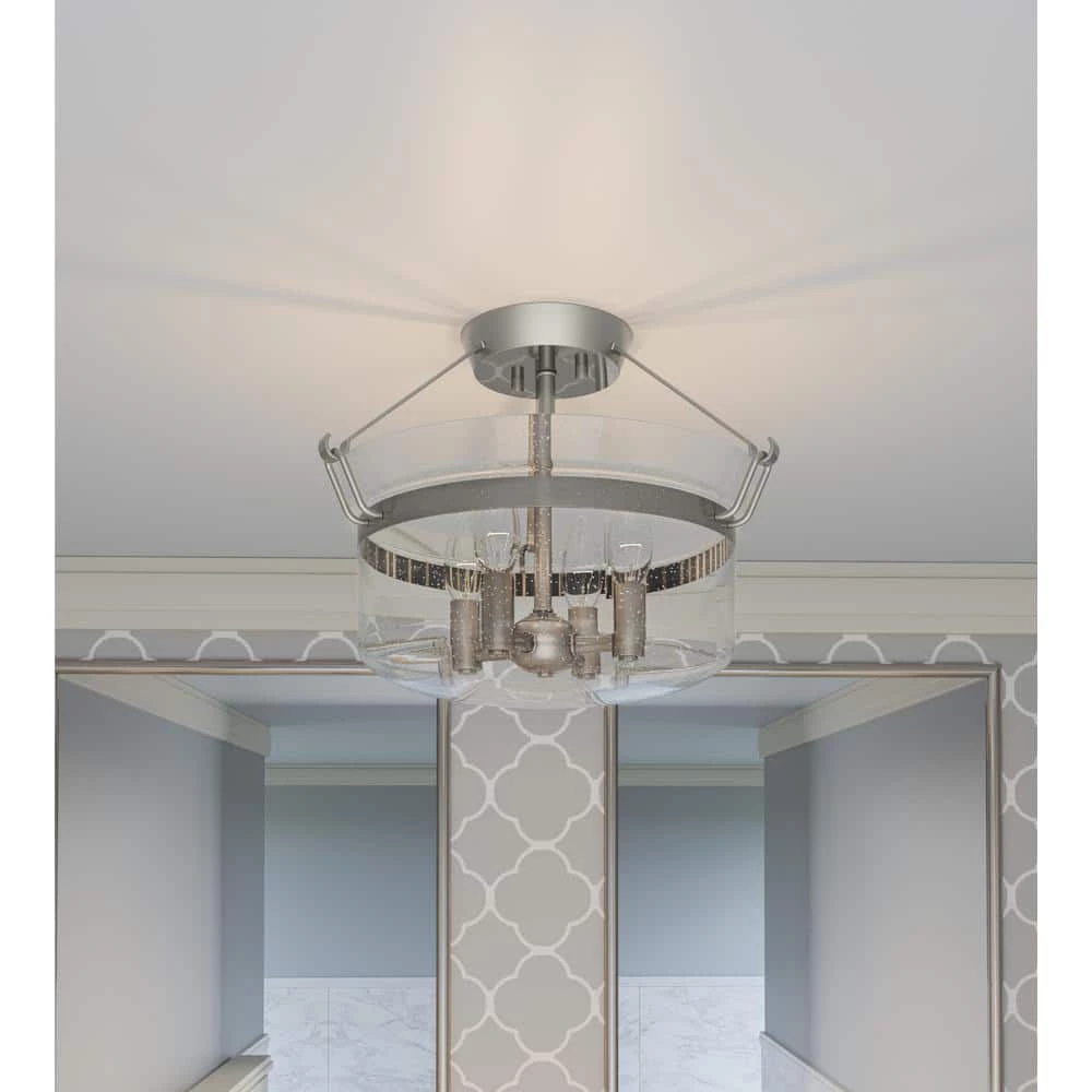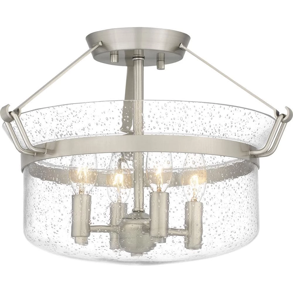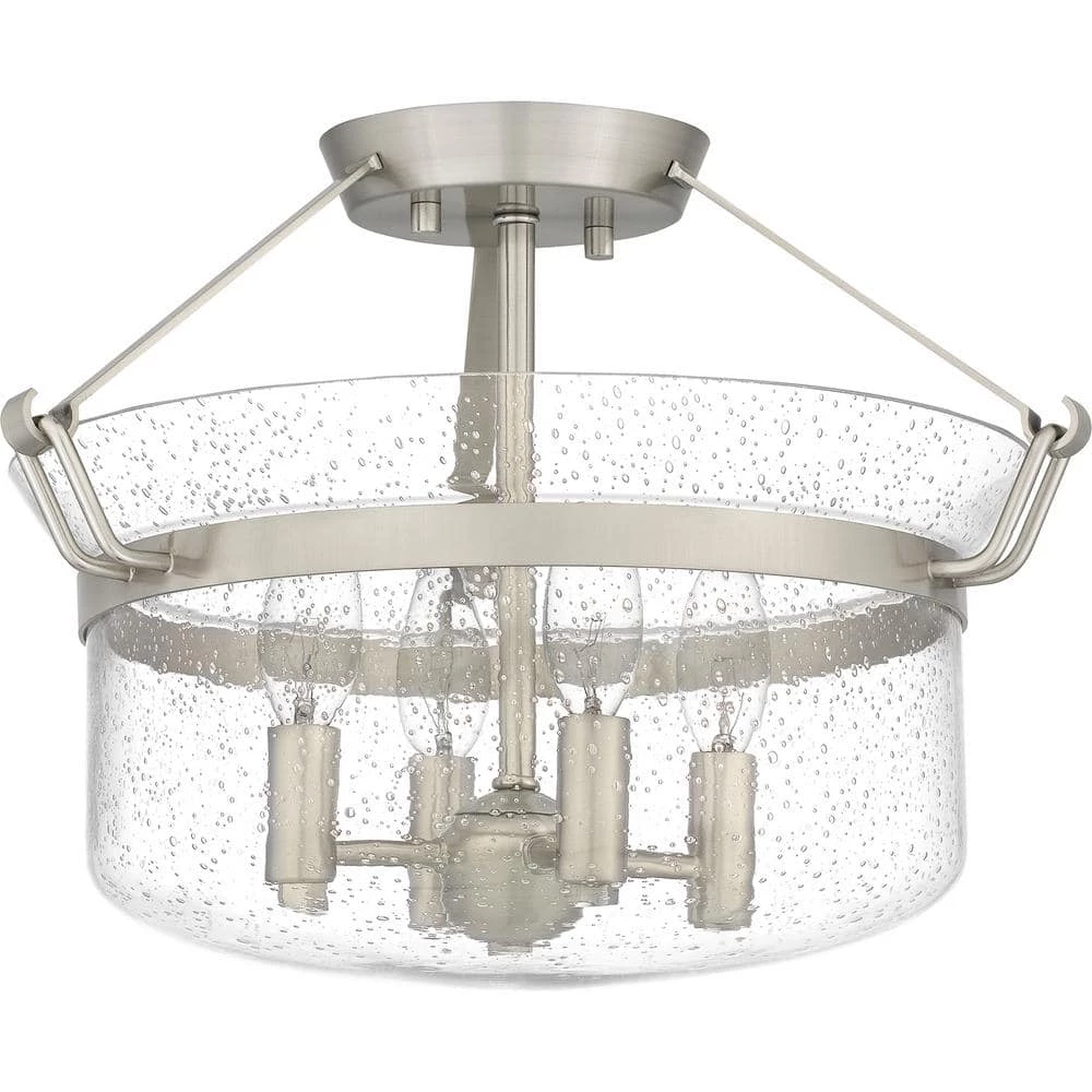 The Prescott semi-flush mount recalls a festive glass of champagne. The clear seeded glass shade creates a sense of effervescent movement, paired with your choice of two timeless finishes. Select brushed nickel to complement neutral spaces or choose aged brass for subtle glam.