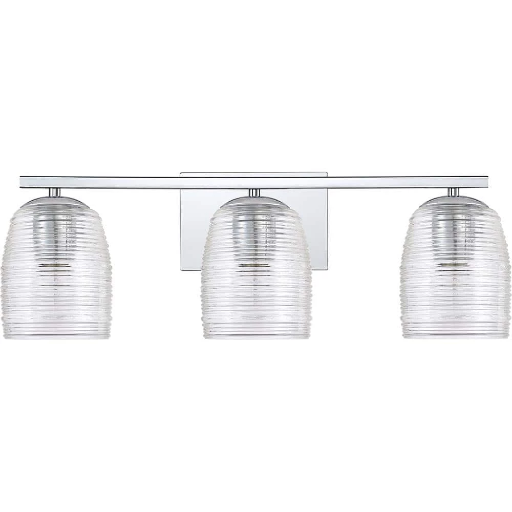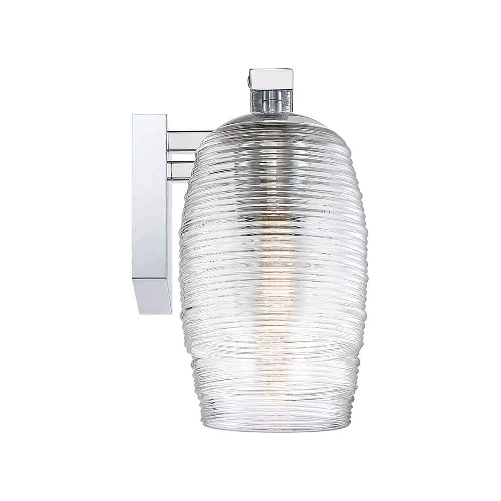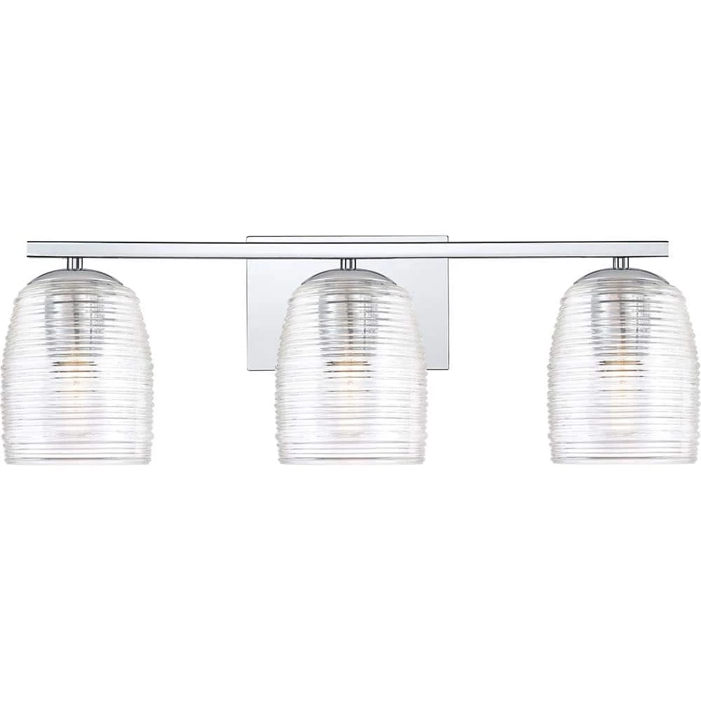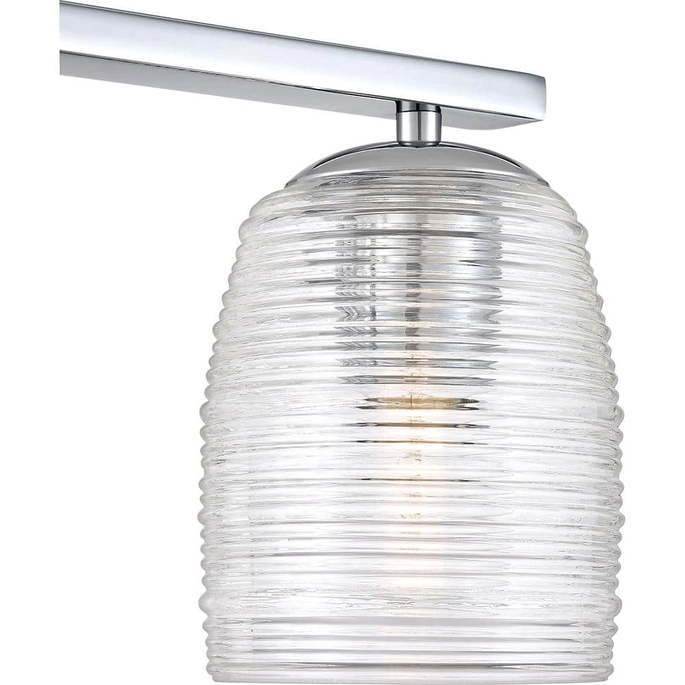 With stunning attention to detail, the Realm is a contemporary delight. The ribbed detailing on the clear spun glass shades provides texture while subtly disguising the bulbs. The support bar and backplate feature clean lines and a sleek polished chrome finish.