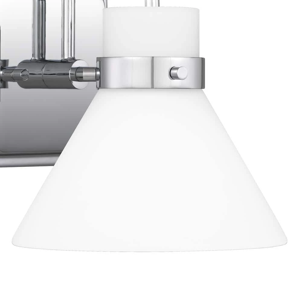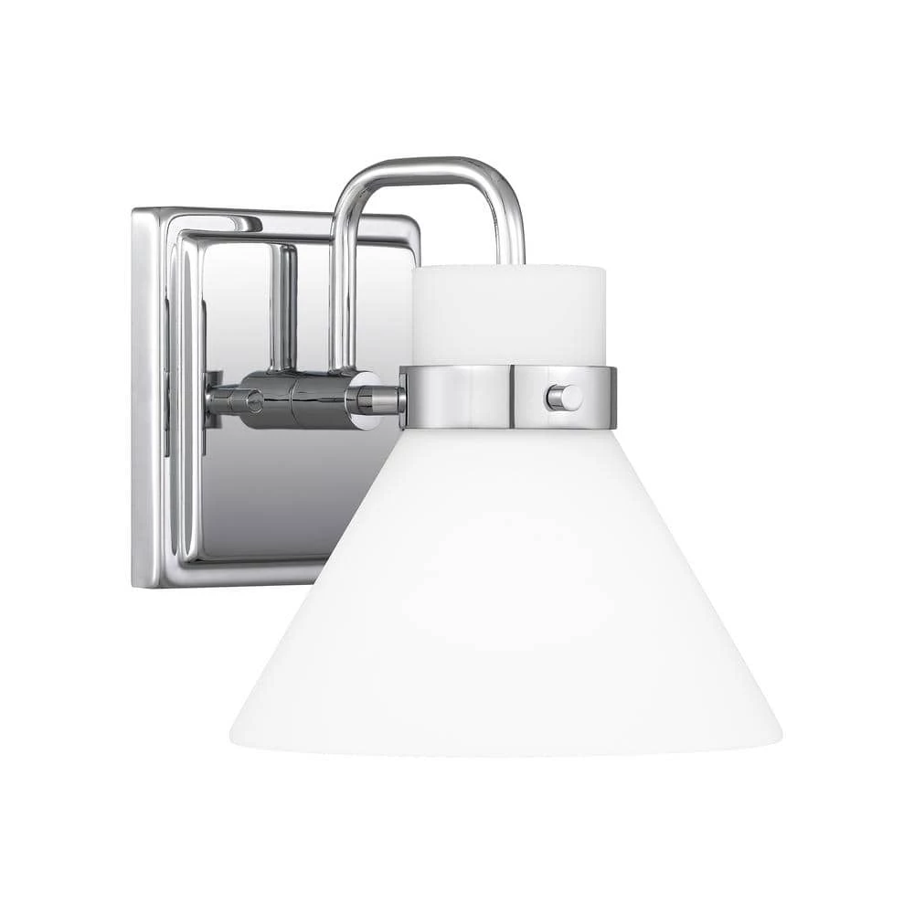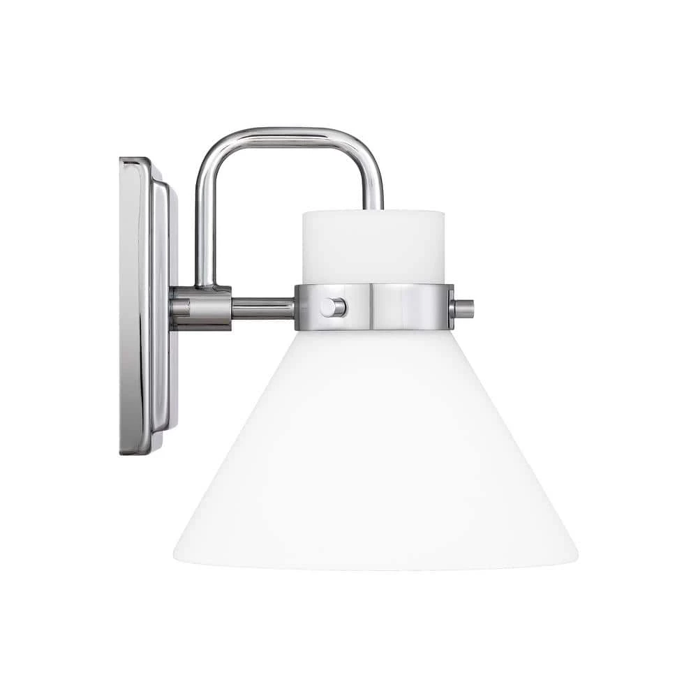 An opal-etched shade casts a warm, milky glow in the Regency sconce. Finished in your choice of polished chrome or weathered brass, the design speaks to classic sensibilities. Configure it facing up for ambient light or turn the shades downward to create more direct illumination.