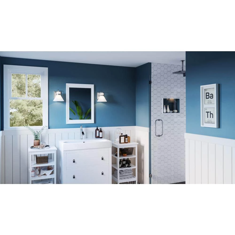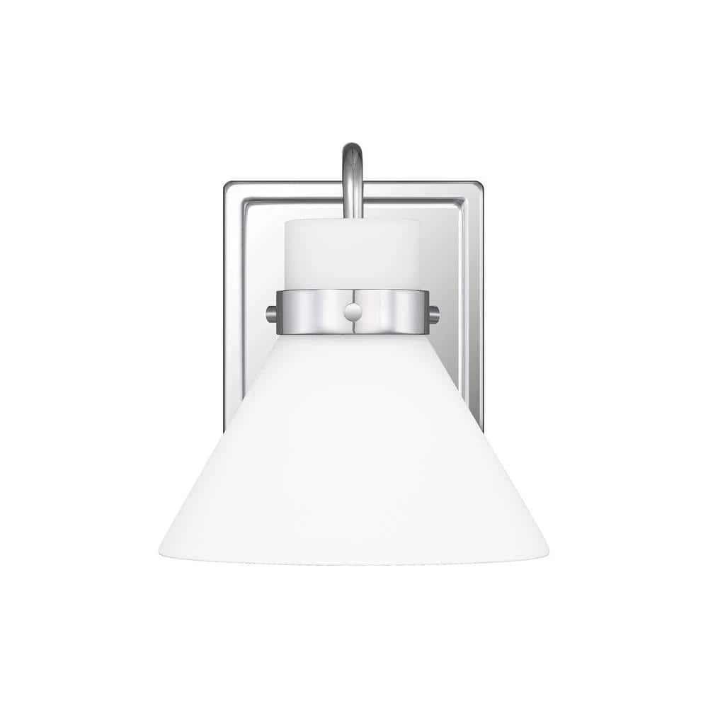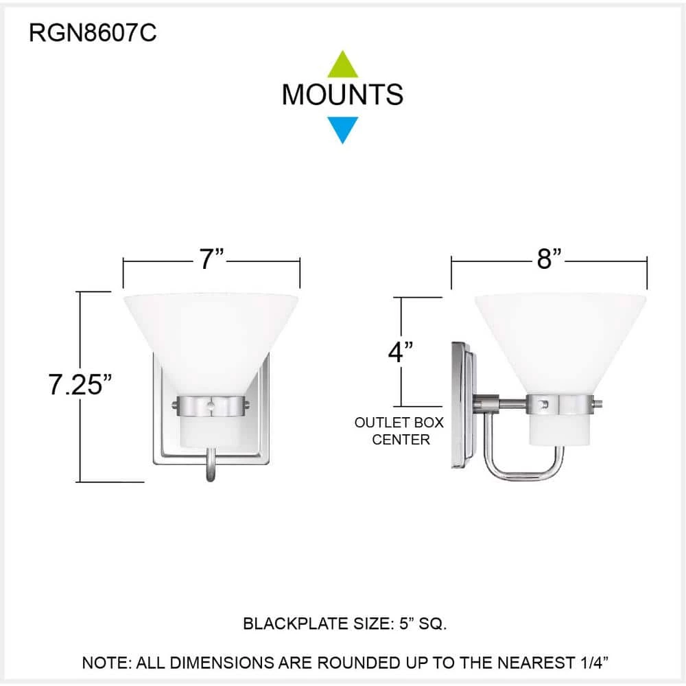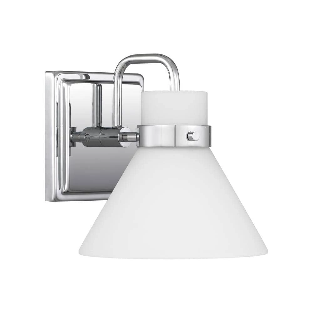 An opal-etched shade casts a warm, milky glow in the Regency sconce. Finished in your choice of polished chrome or weathered brass, the design speaks to classic sensibilities. Configure it facing up for ambient light or turn the shades downward to create more direct illumination.