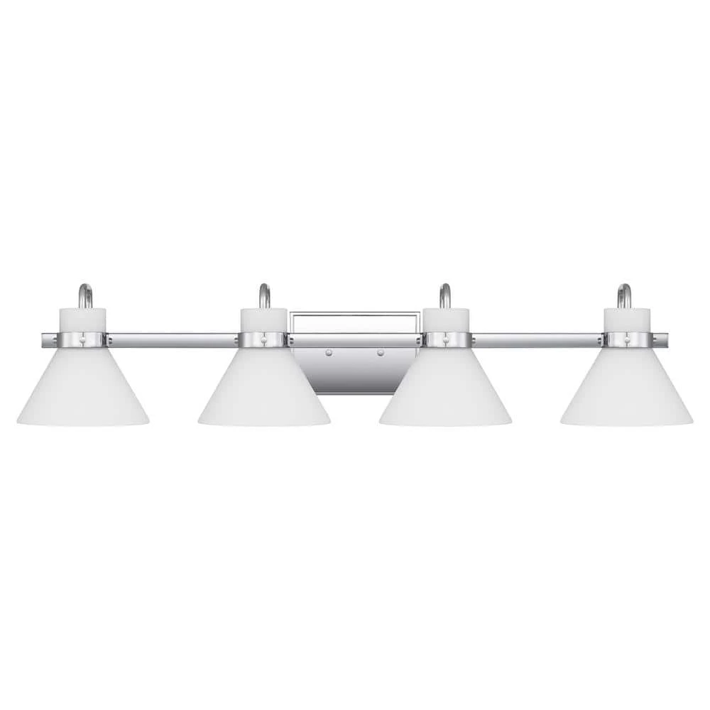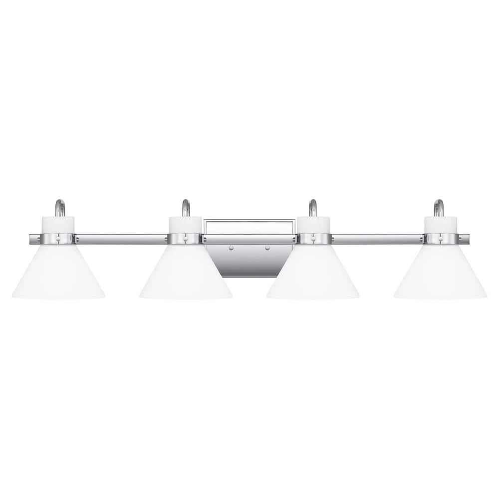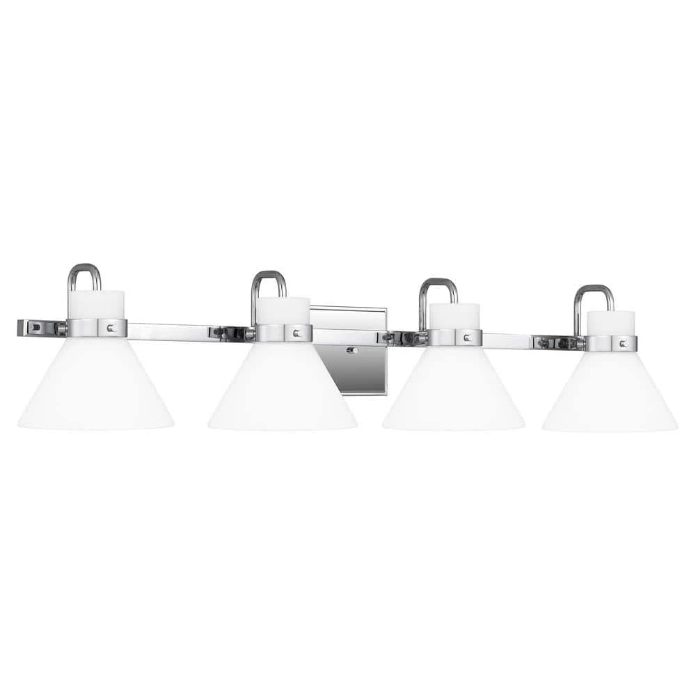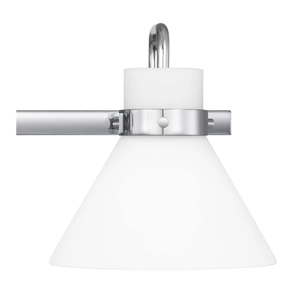 The Regency bath light gets its warm, milky glow thanks to opal-etched shades. Radiate crisp and classic style in the polished chrome finish or choose weathered brass for a nod to vintage-inspired refinement. The light can be affixed with shades pointed up or down.