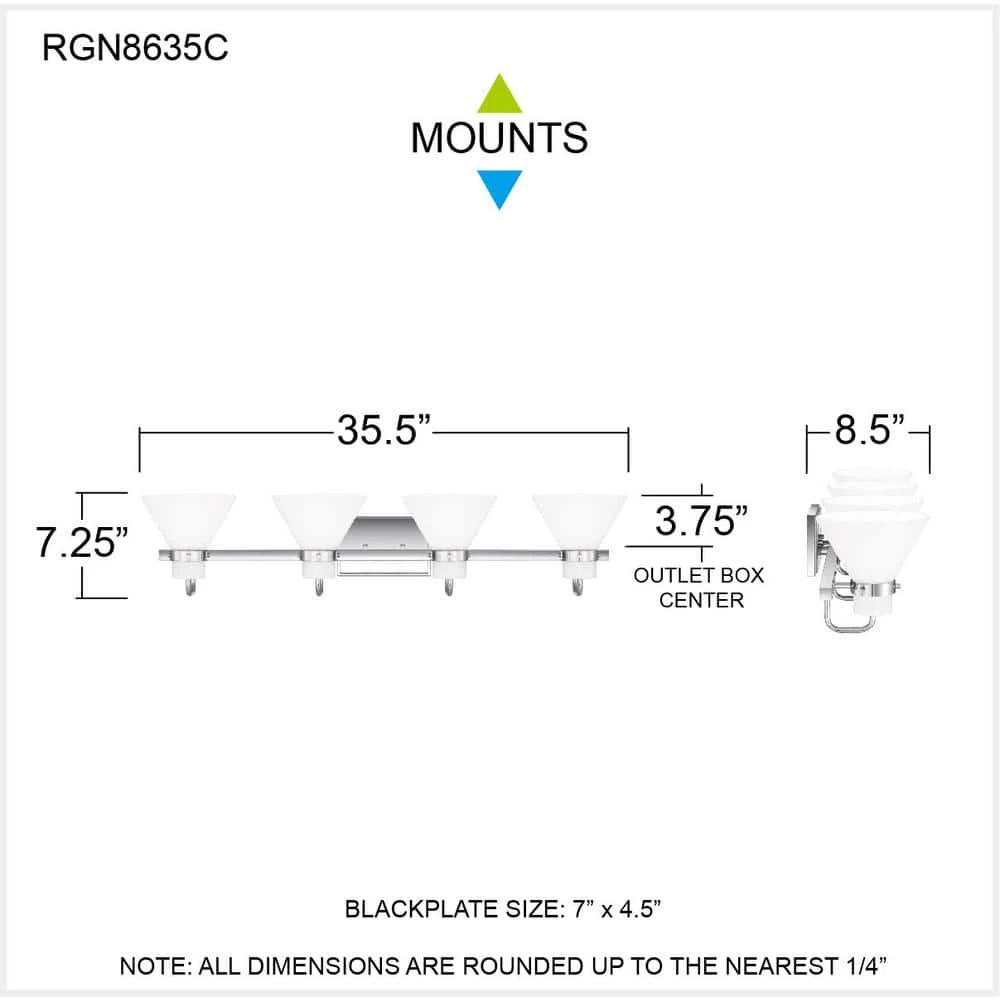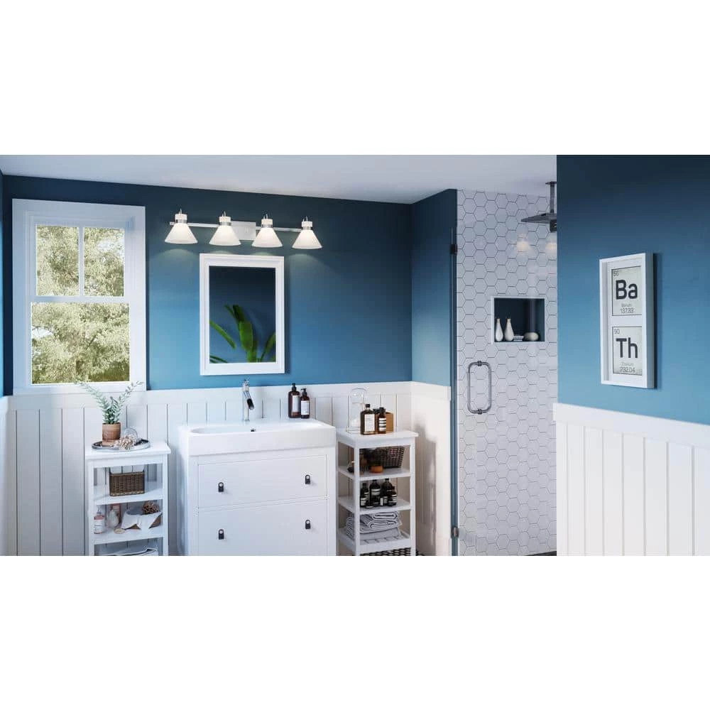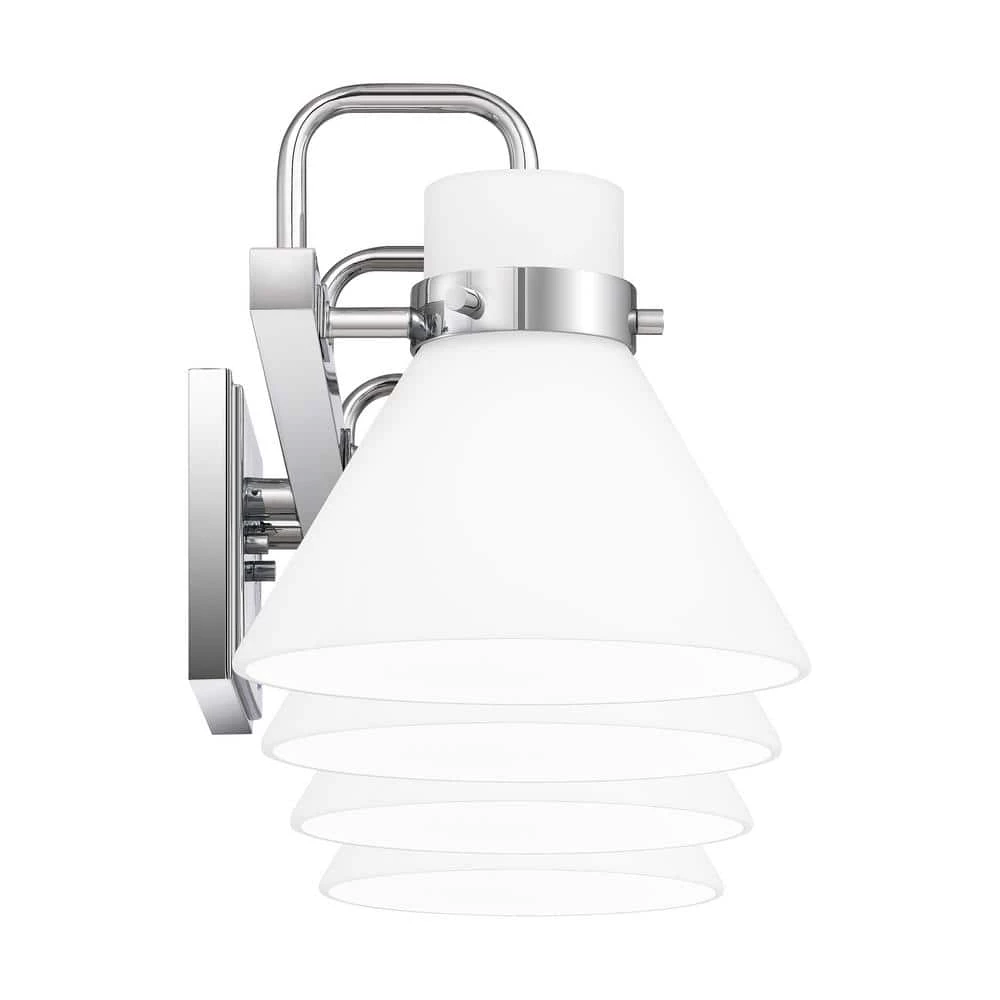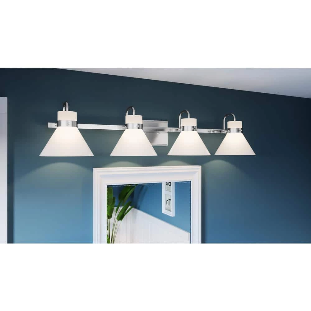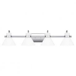The Regency bath light gets its warm, milky glow thanks to opal-etched shades. Radiate crisp and classic style in the polished chrome finish or choose weathered brass for a nod to vintage-inspired refinement. The light can be affixed with shades pointed up or down.