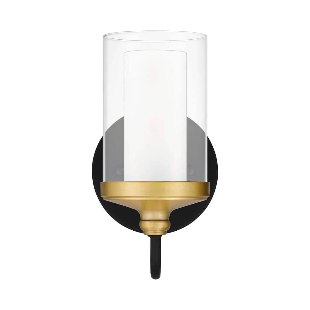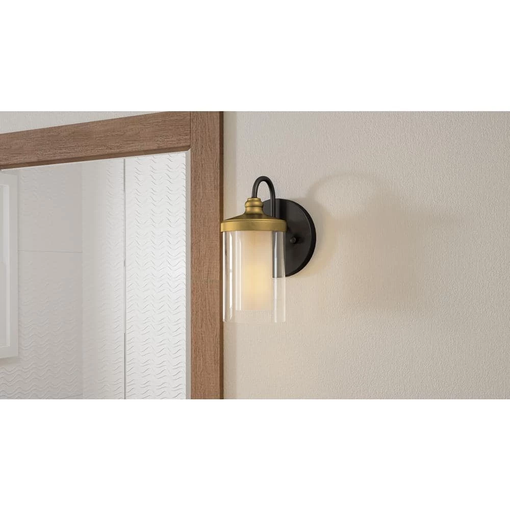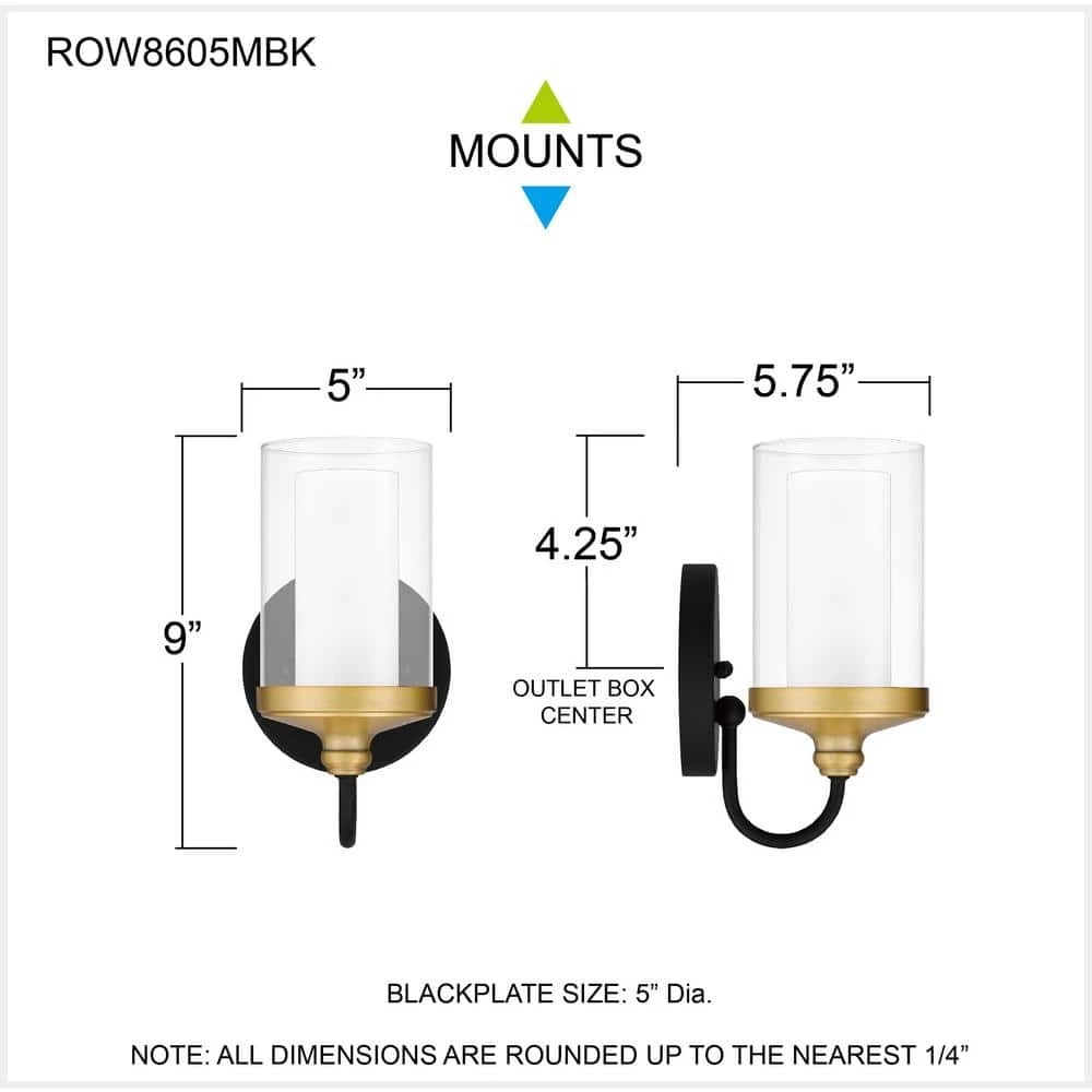 Position the Rowland sconce up or down – each choice casts its own unique illumination. in a matte black finish, this sconce features a clear glass shade with the warmth of brass tones and a decorative, curved arm. Simple yet striking, the design complements a modern farmhouse aesthetic.