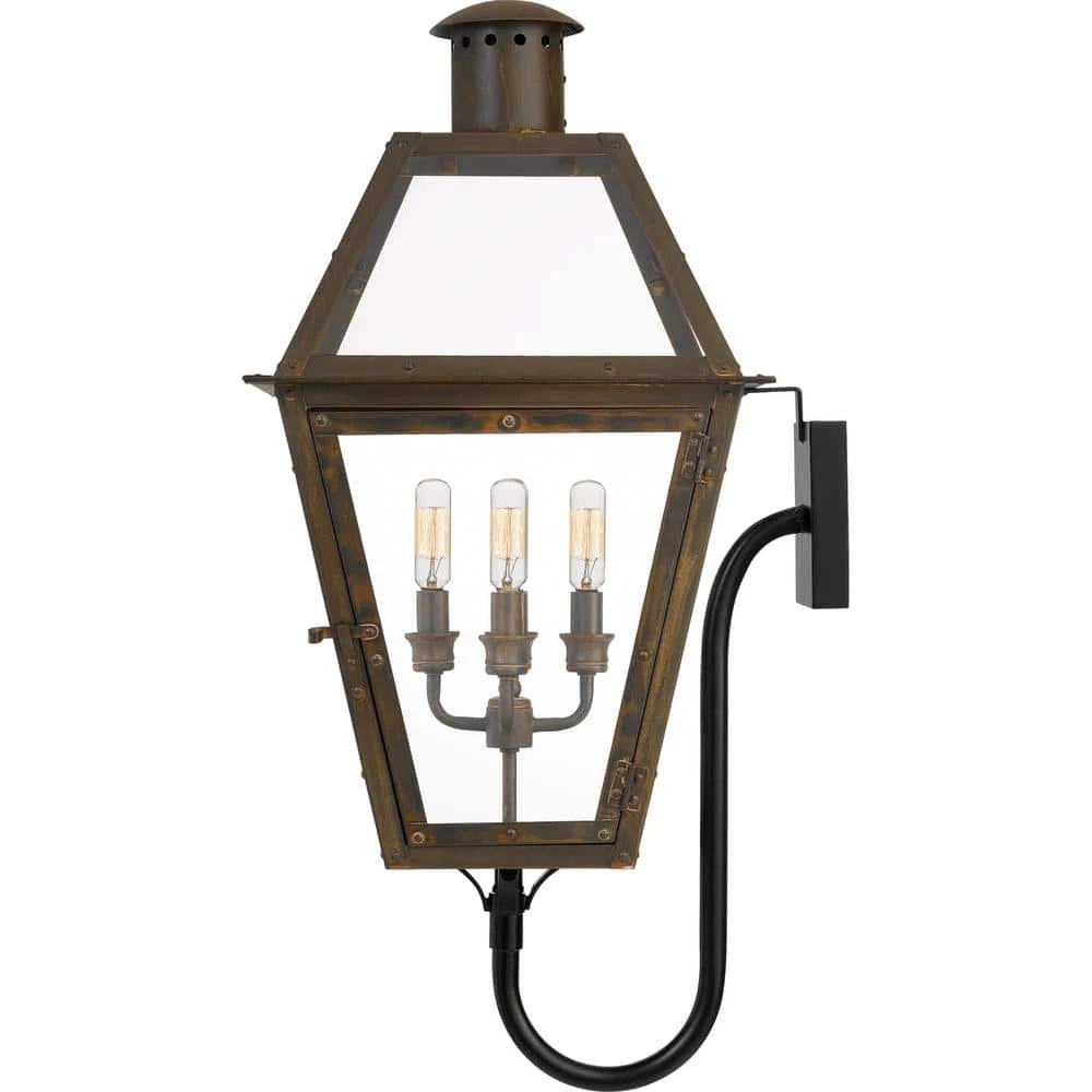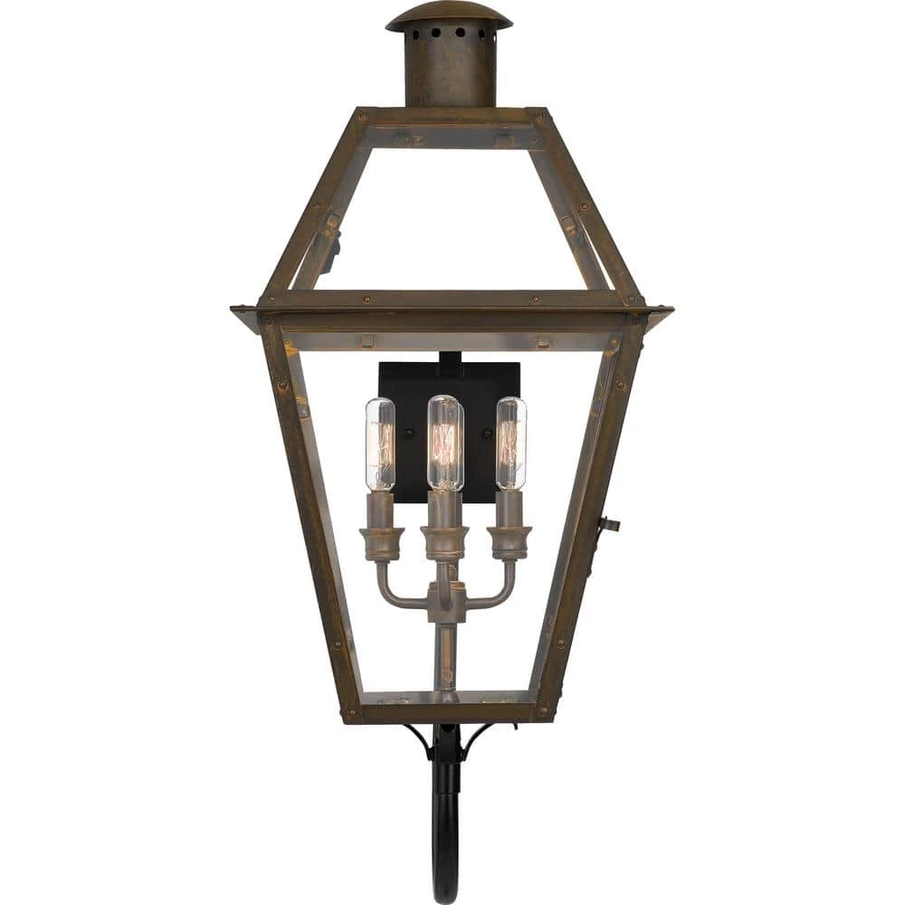 From the Charleston Copper & Brass Lantern Collection, the Rue De Royal outdoor lantern offers the historic look of gas lighting without the hassle of a propane feed. It is all electric and features a hand-riveted metal frame, combining the romantic charm of an antique lantern with the modern convenience of energy efficiency. The industrial bronze finish adds antique charm and depth, while the aged copper finish evokes a French countryside feel.