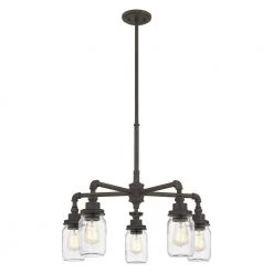 Pure, vintage charm. Rated for outdoor use, the Squire chandelier feels both industrial and handmade at once, with its Mason-jar-inspired shades and pipe-like arms. The rustic black finish recalls true vintage character while an extended drop makes it the perfect solution for high-ceiling spaces.