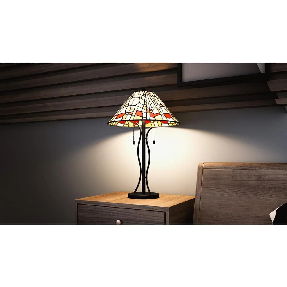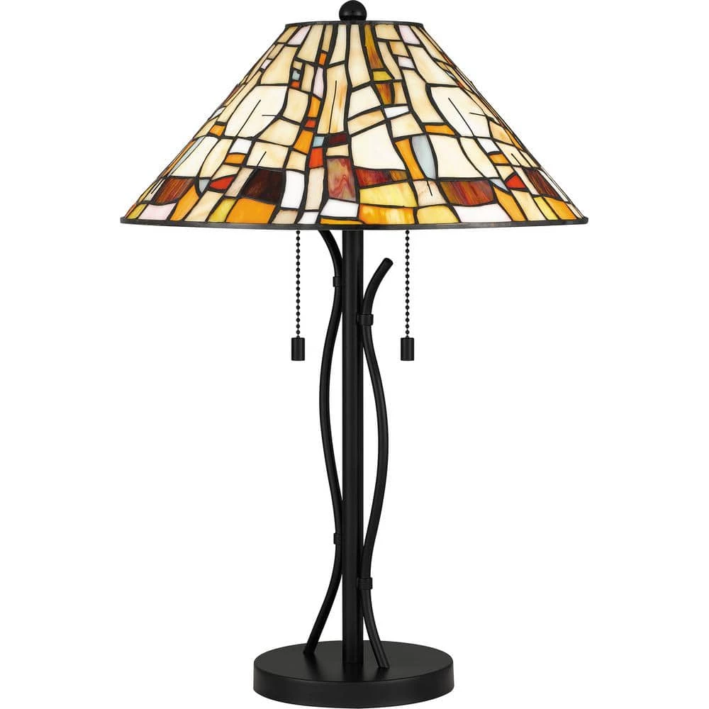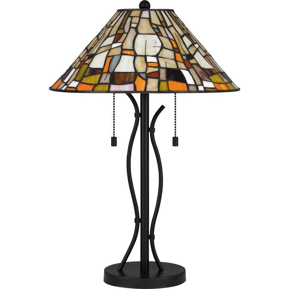 The prettiest puzzle. The Stinson table lamp, also available as a flush mount, fits together varying shapes and tones with multicolor art glass. The effect is artistic and impressive, finished with a matte black, curved base and pull chains for two bulbs.