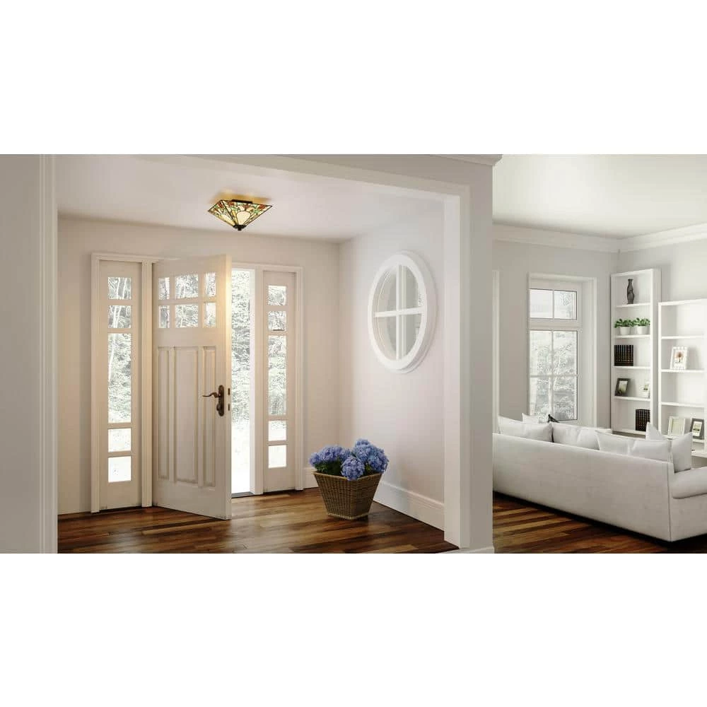 Inspired by the intricate works of Tiffany, the Westwind series features a stylized botanical motif in multicolored art glass. As a table lamp, this piece includes a textured, matte black base and 2 pull chains. The flush mount style casts a lit-from-within glow.