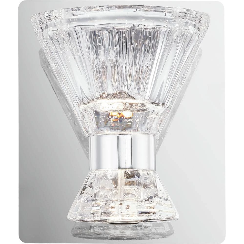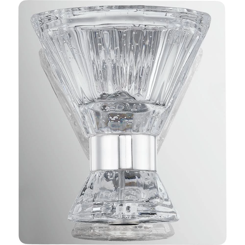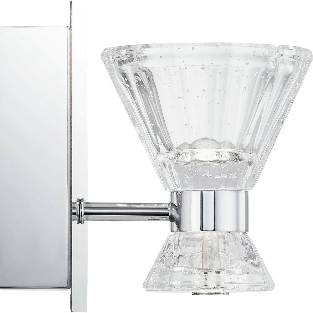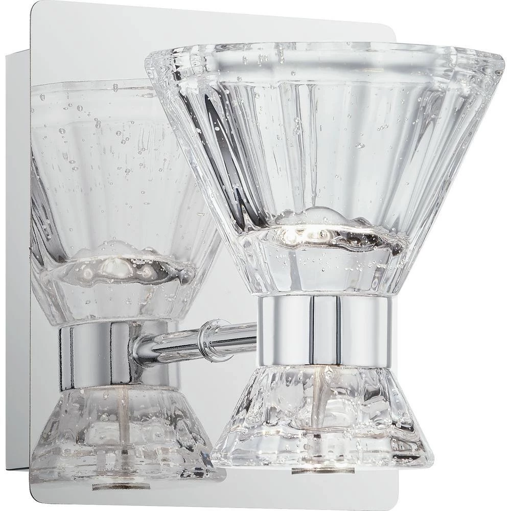 The Zuri collection will bring a contemporary, yet edgy touch to your bathroom. The clear seedy glass shades cast the light upwards and downwards for a unique design component. The Polished Chrome backplate pops behind the Integrated LED lights that are both stylish and energy efficient. This fixture can be hung as an uplight or a downlight depending on your preference.